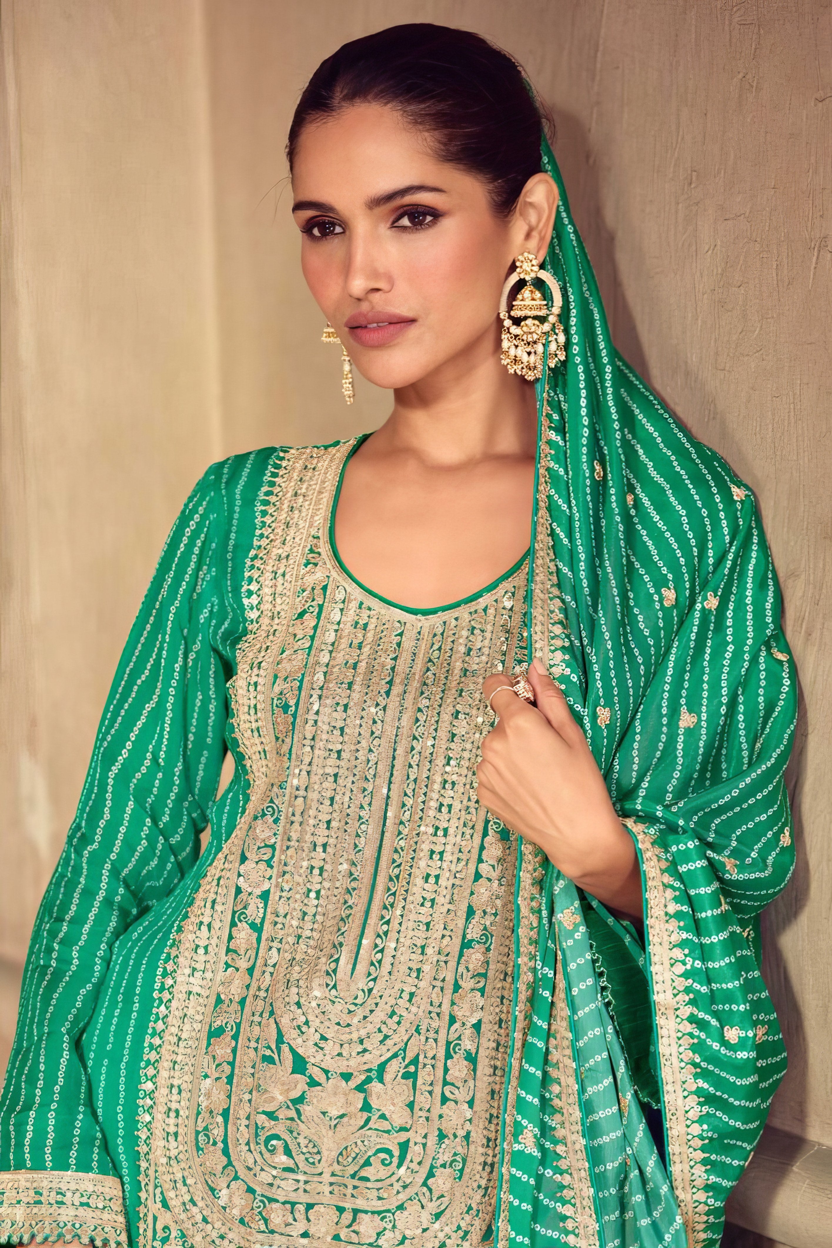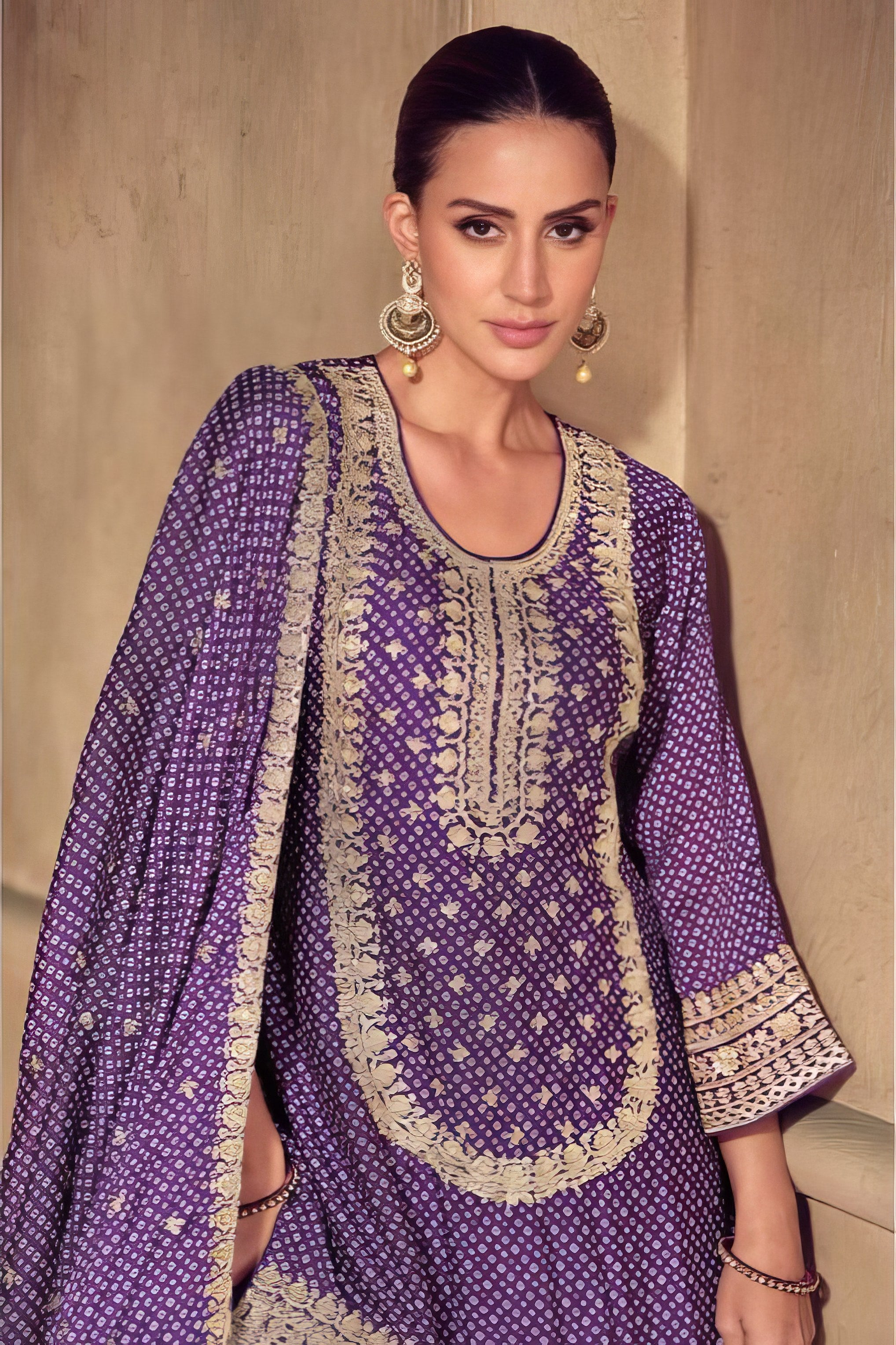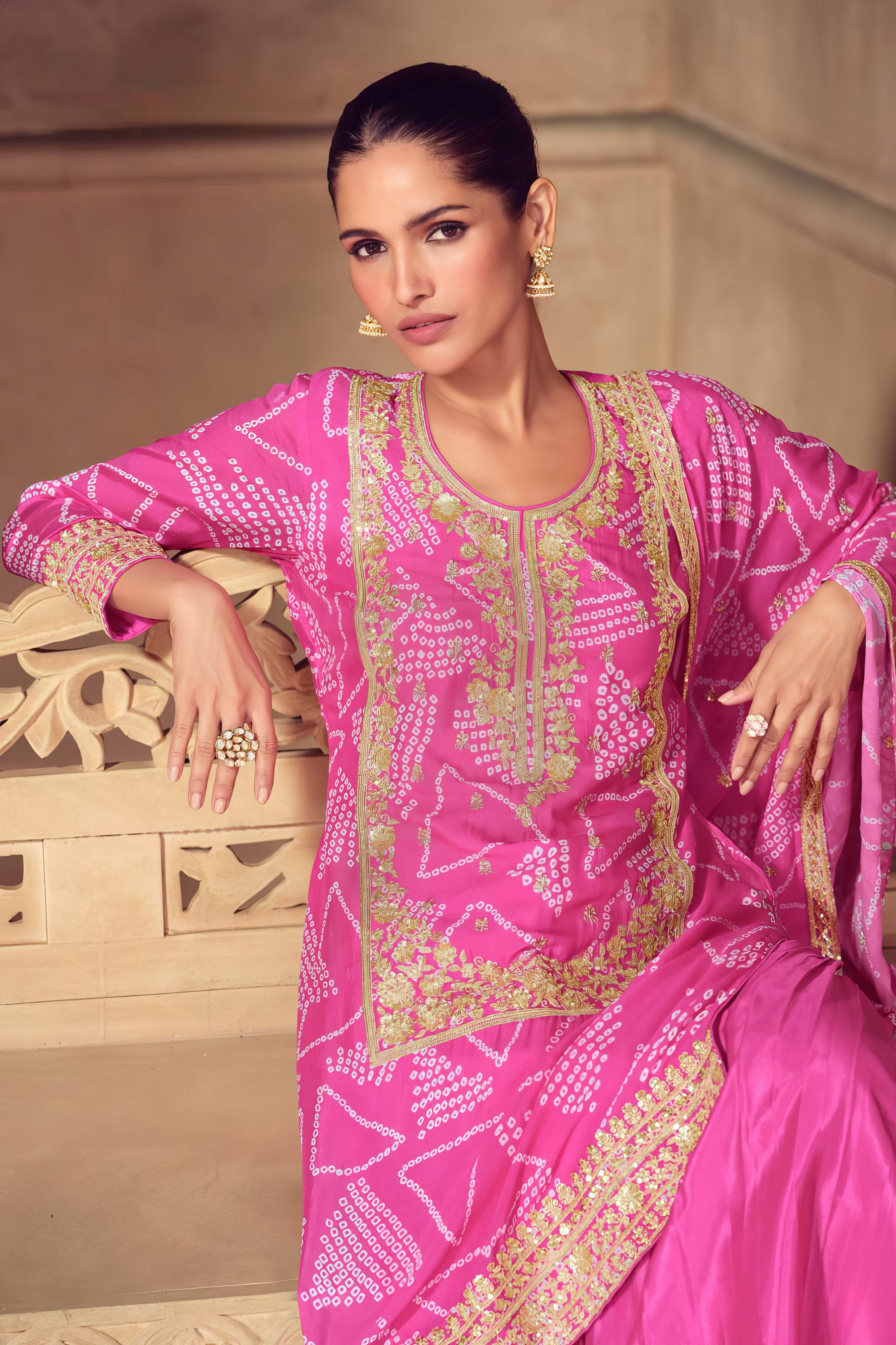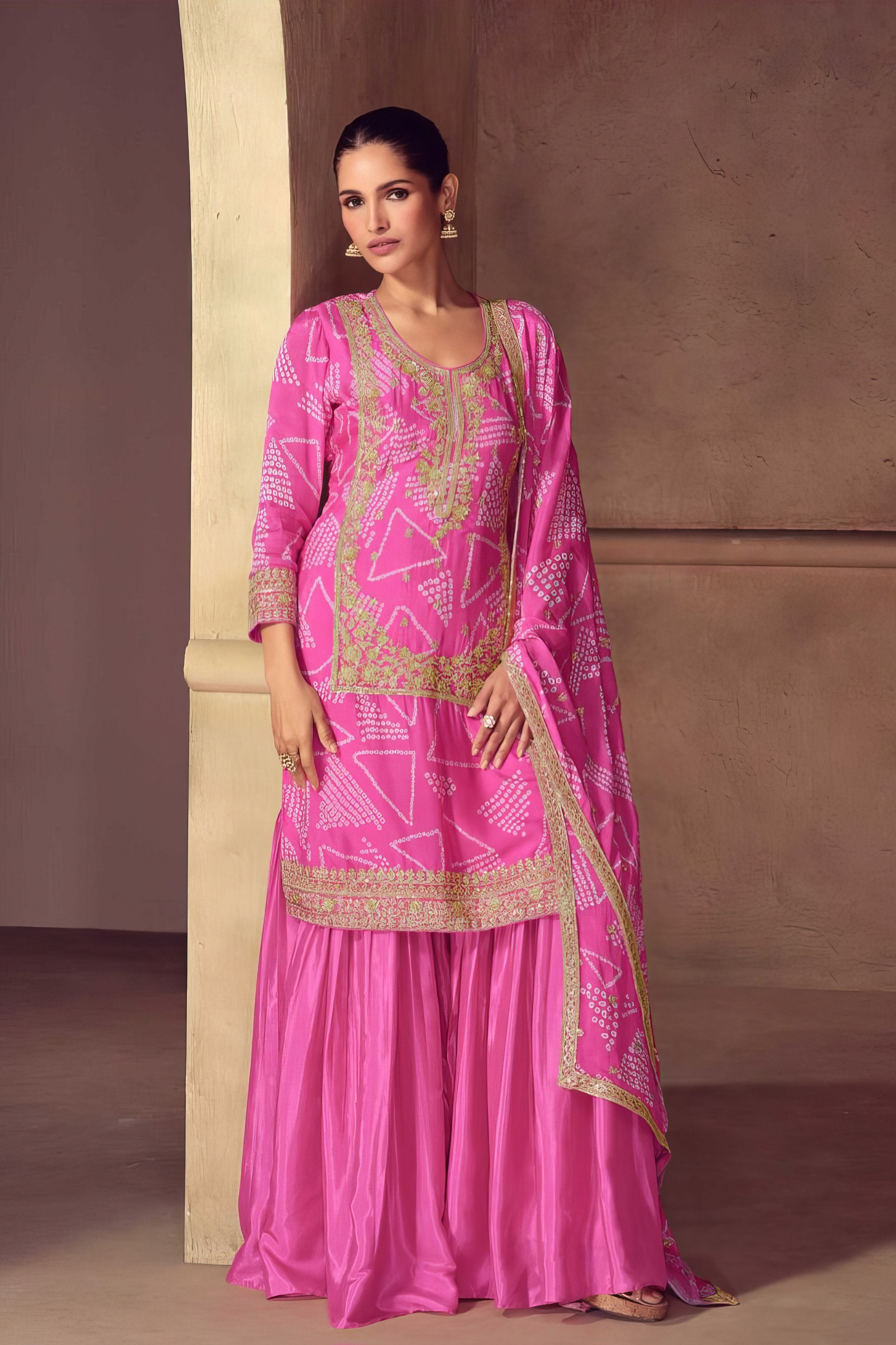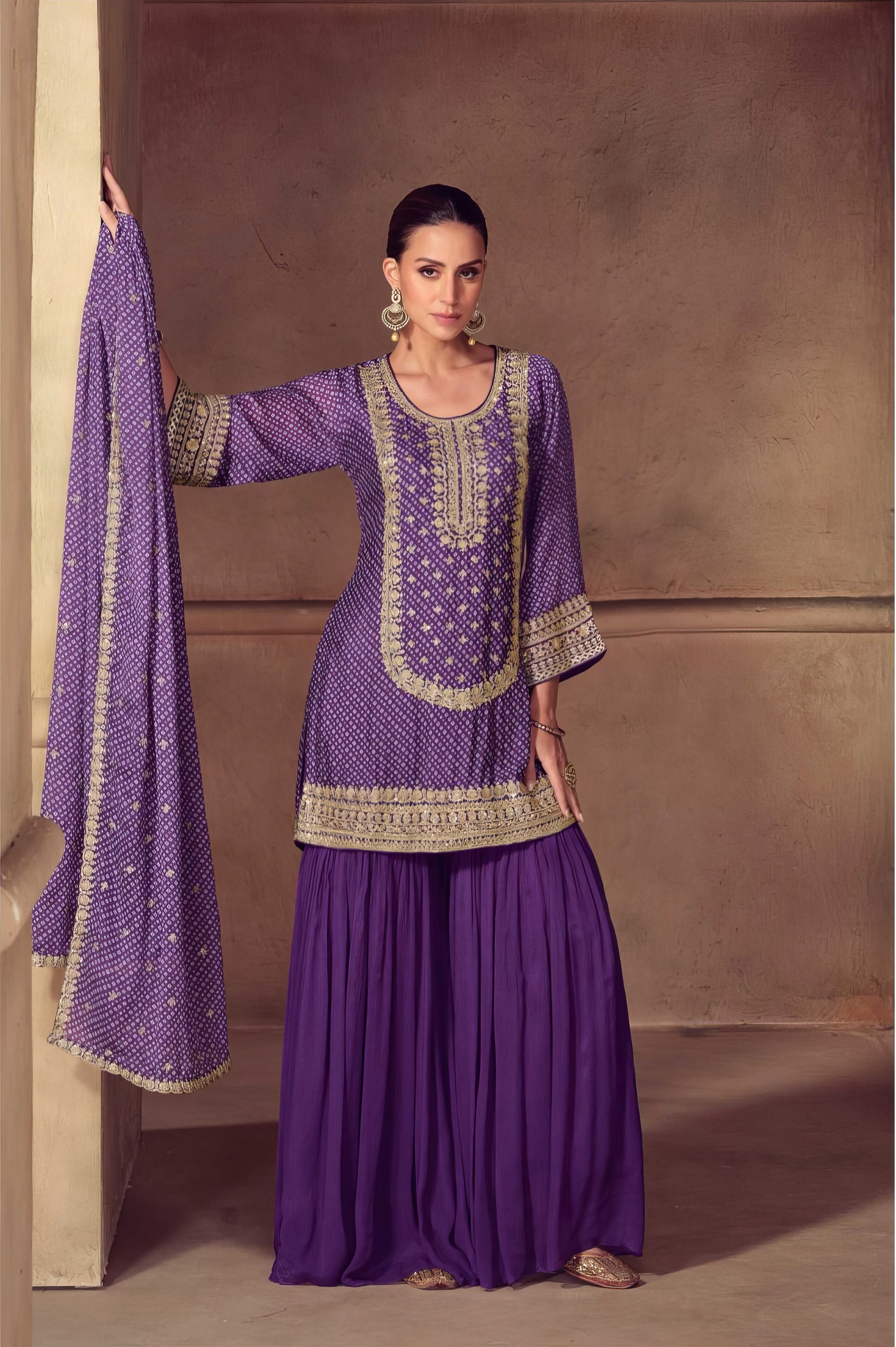 Grace meets grandeur in this beautifully designed Sharara suit, crafted entirely from luxurious premium Chinon silk. The top features a rich, flowing silhouette that drapes effortlessly, offering a soft sheen and elegant fall. Paired with a wide-flared sharara bottom made from the same premium fabric, it brings comfort, volume, and festive flair to your look. The matching Chinon dupatta adds a final layer of elegance, making this ensemble ideal for weddings, festive gatherings, and traditional celebrations. Subtle yet striking, this outfit blends modern sophistication with timeless ethnic charm.