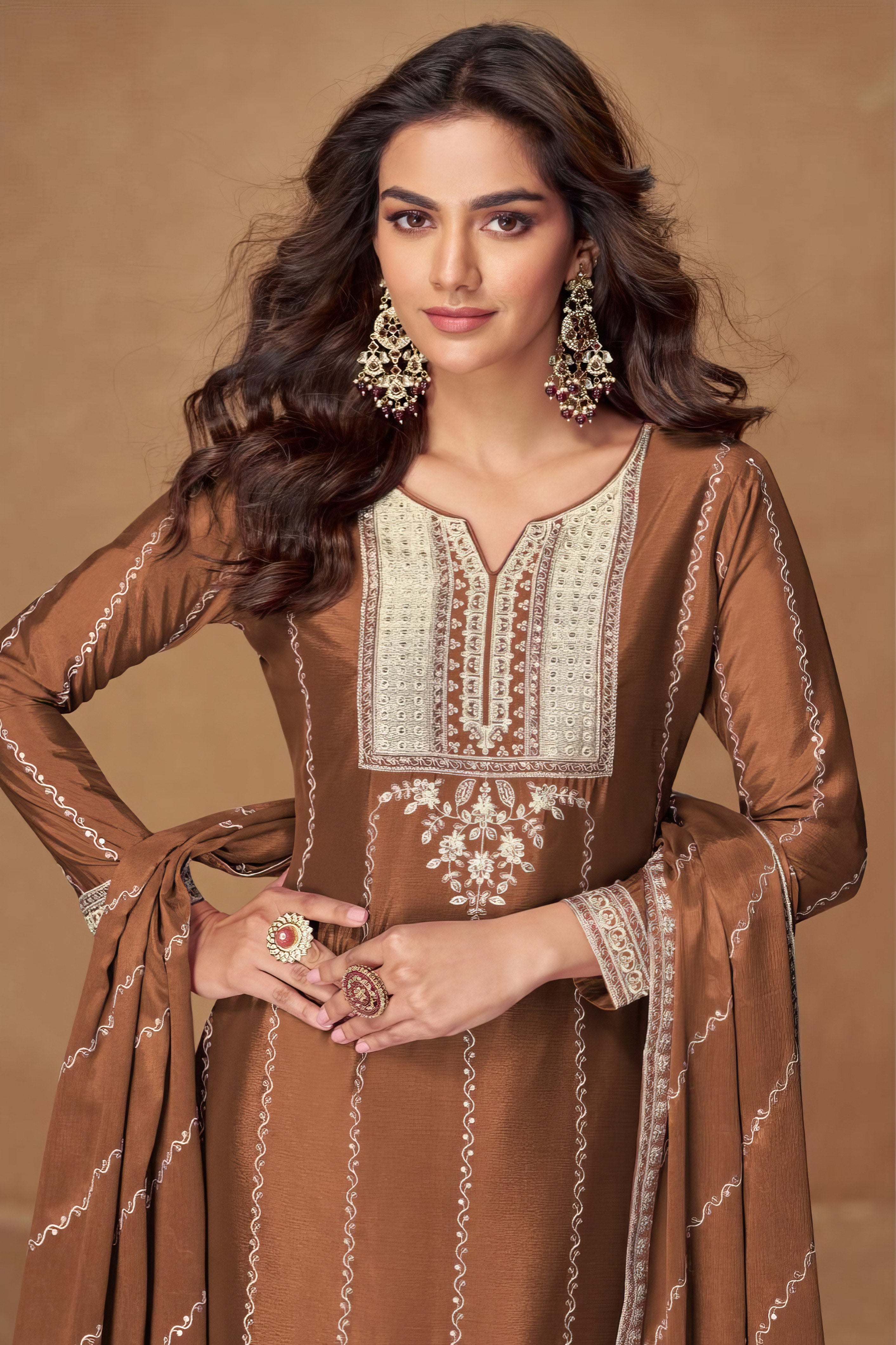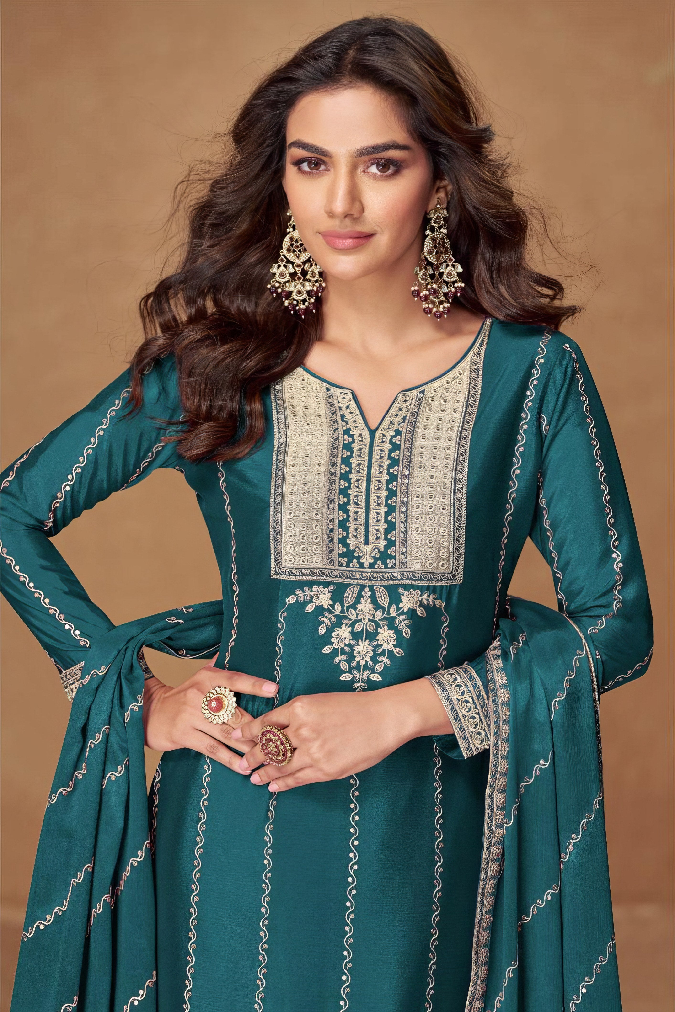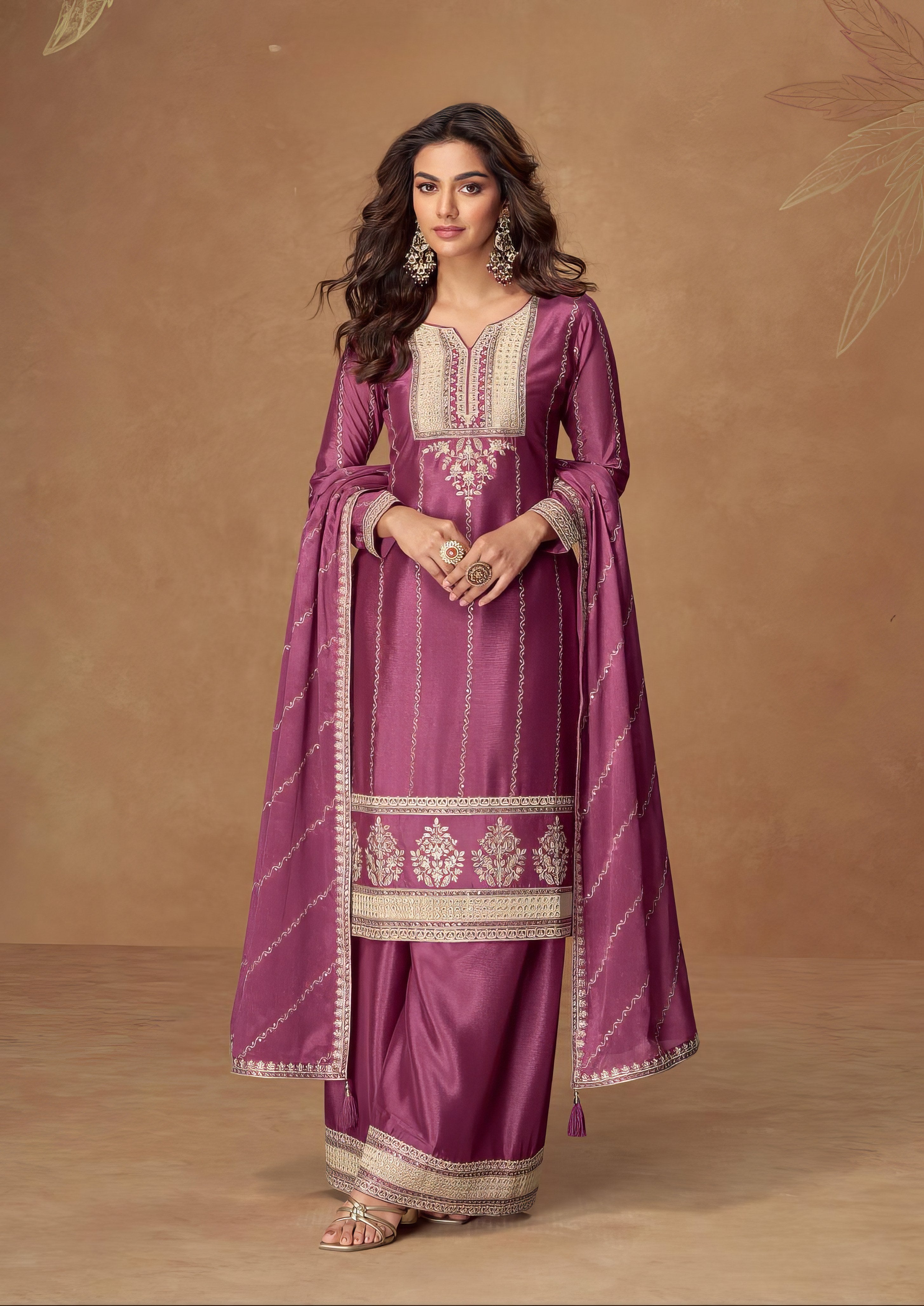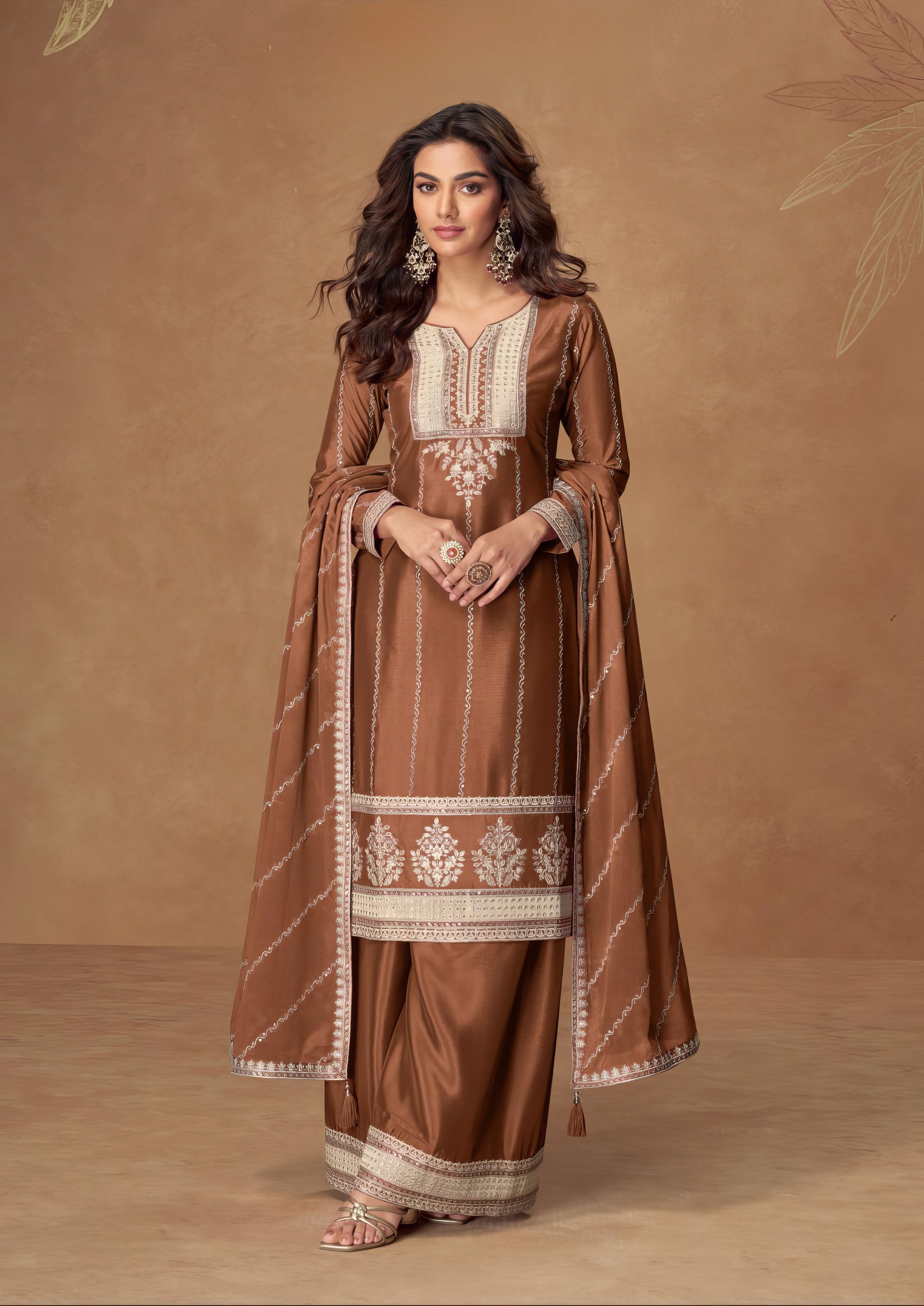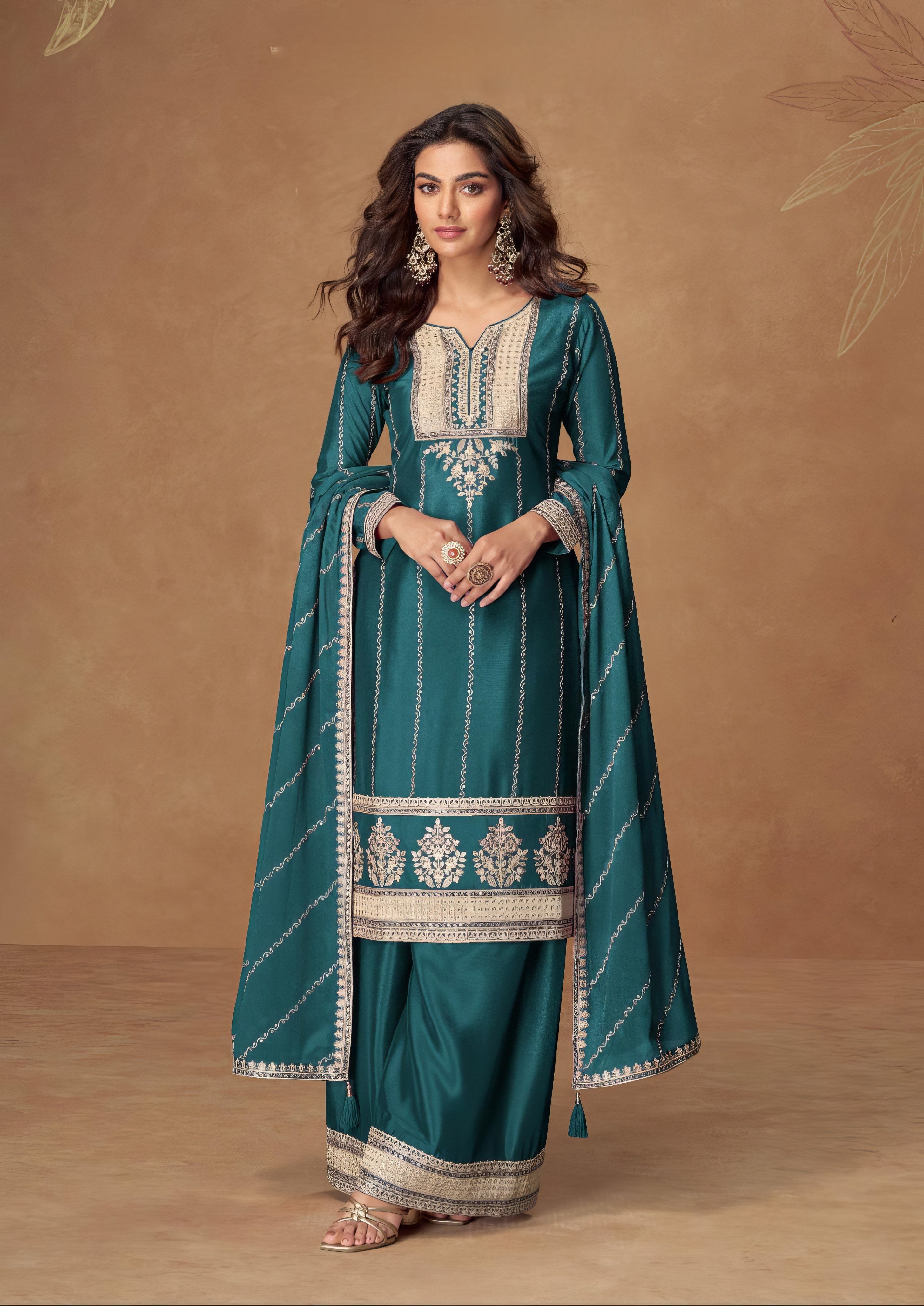 This vibrant sharara set features a sleeveless blouse in colorful patchwork-style embroidery, crafted on premium chinnon silk for a rich, festive look. The flared plazzo bottom complements the blouse with its smooth drape and sheen. Paired with a matching dupatta in premium chinnon silk, this ensemble radiates traditional charm with a modern twist. Sleeves are included (attached separately).