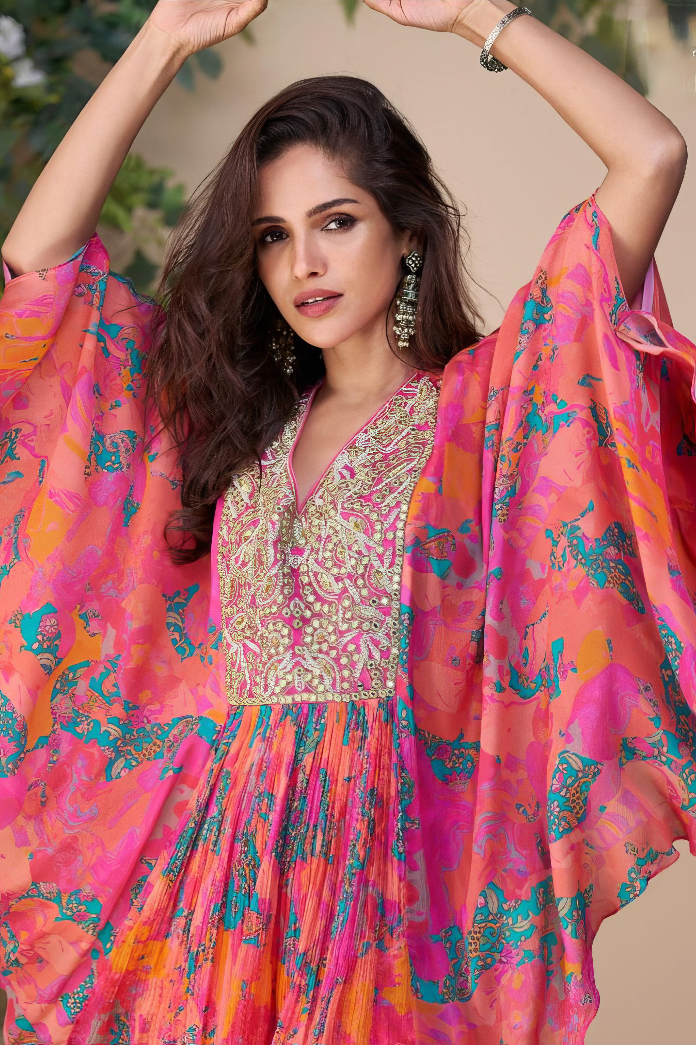 This designer ensemble features a unique poncho-style top crafted from premium real chinon silk, beautifully adorned with intricate embroidery and hand-embellished detailing. The flowing silhouette adds a touch of elegance, while the matching palazzo offers both comfort and grace. This contemporary yet ethnic look is ideal for festive and statement occasions.