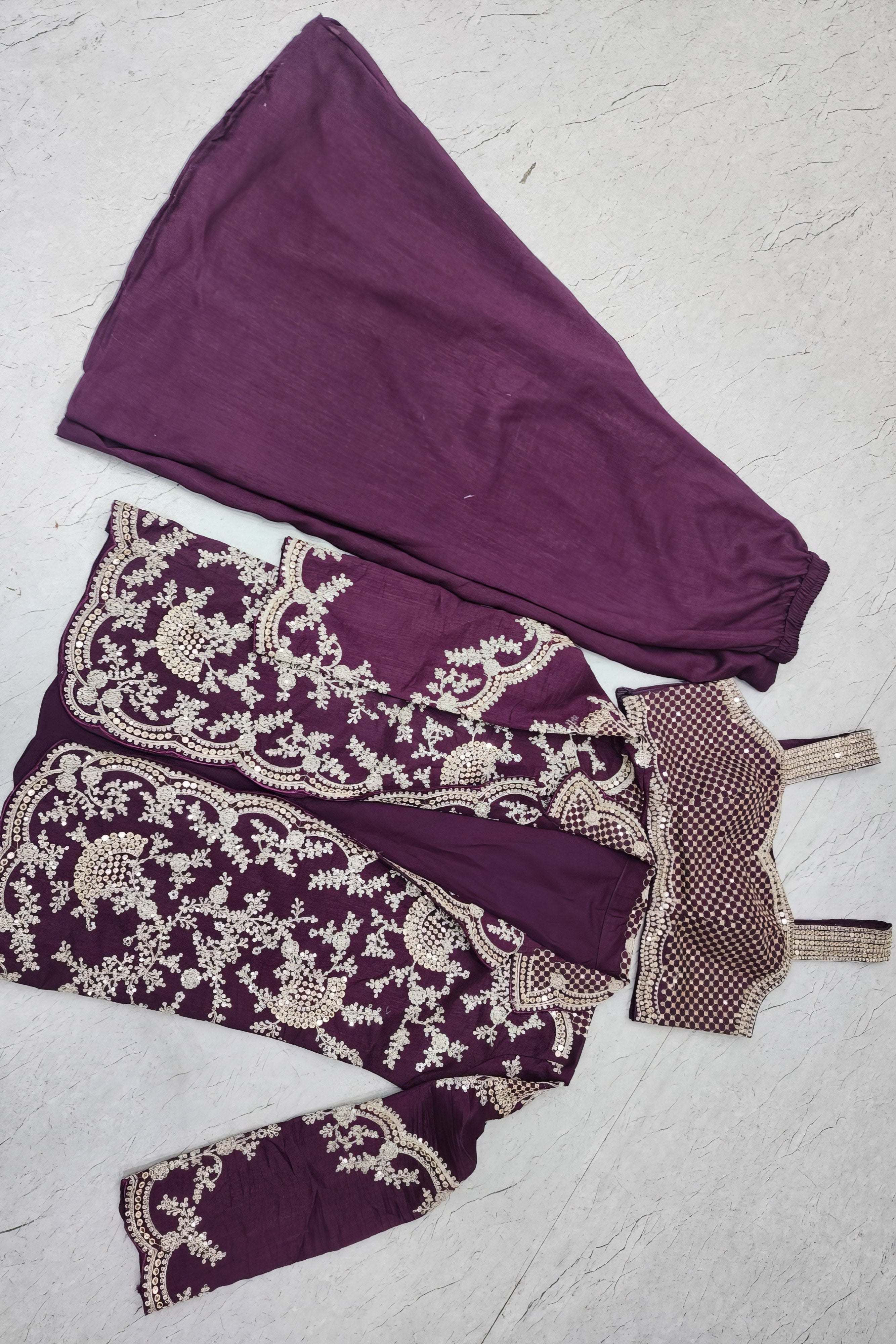 This stylish three-piece set features a fully stitched choli crafted from chinon silk, embellished with delicate embroidery and elegant dori sequence work. It is layered with a matching embroidered jacket in chinon silk that adds dimension and grace to the ensemble. The look is completed with a coordinating palazzo in the same luxurious fabric. With its contemporary silhouette and festive detailing, this set is perfect for celebrations and statement occasions.
