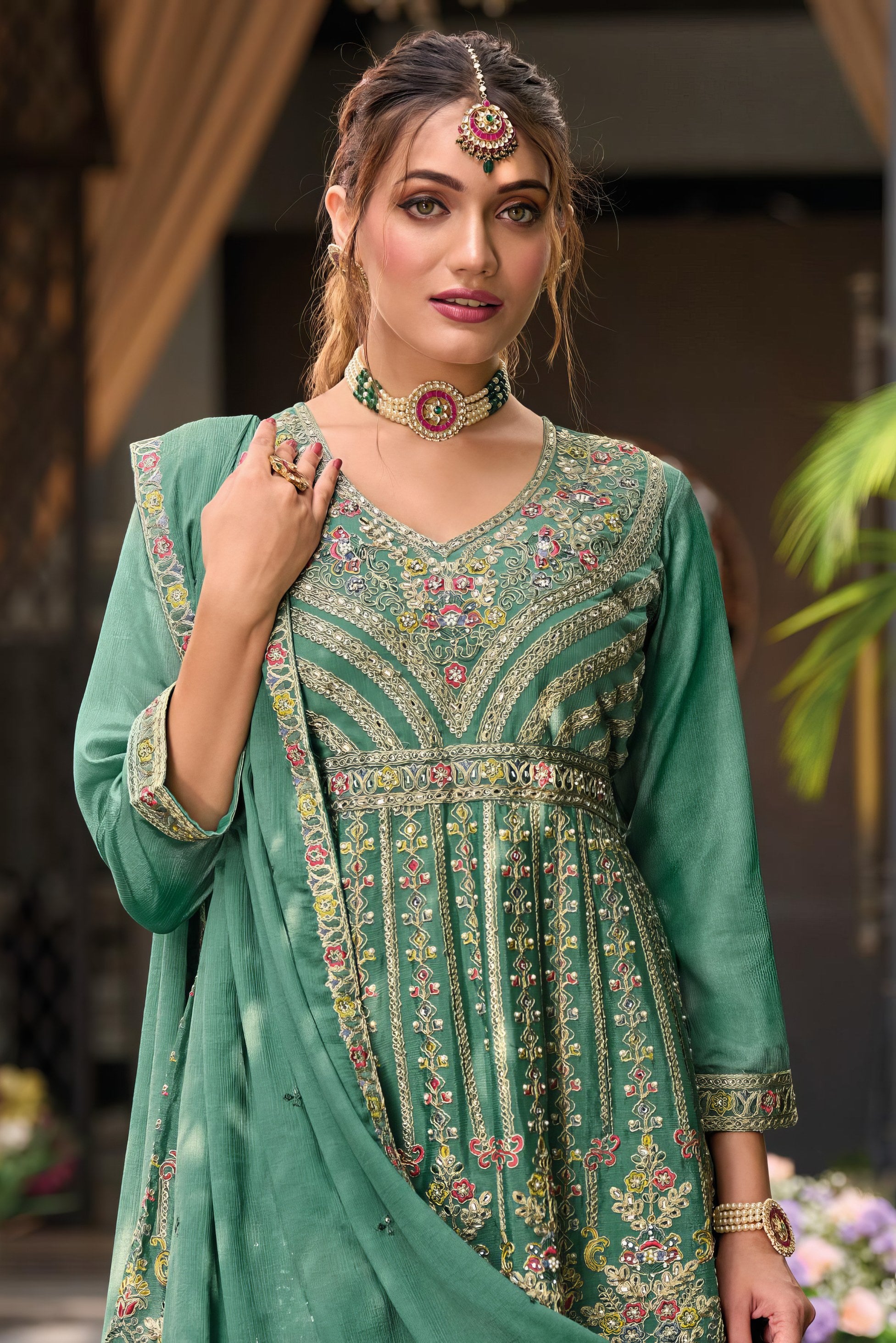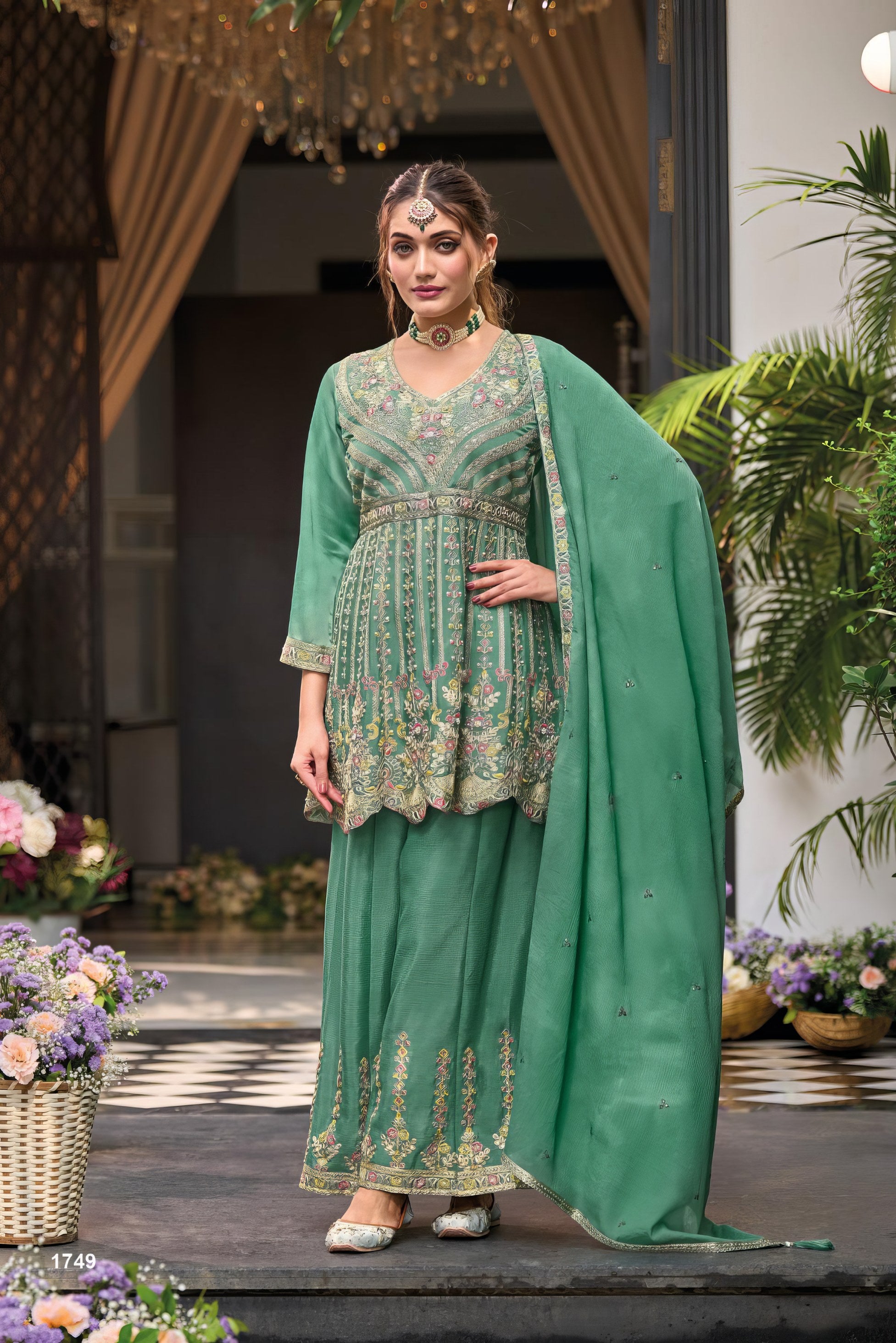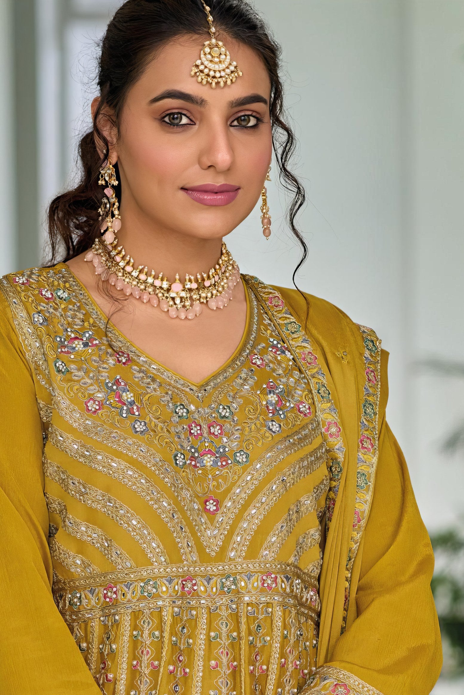 This elegant full stitched plazzo suit is made from premium Heavy Chinon fabric, richly adorned with embroidery on both the front and back of the top and plazzo. The beautifully designed silhouette is balanced with a matching embroidered dupatta, making it a perfect ensemble for grand festivities and traditional occasions.