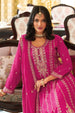 Elegant heavy Chinon top with intricate embroidery, paired with matching plazo and an embroidered Chinon dupatta. Perfect for festive occasions, weddings, and parties.