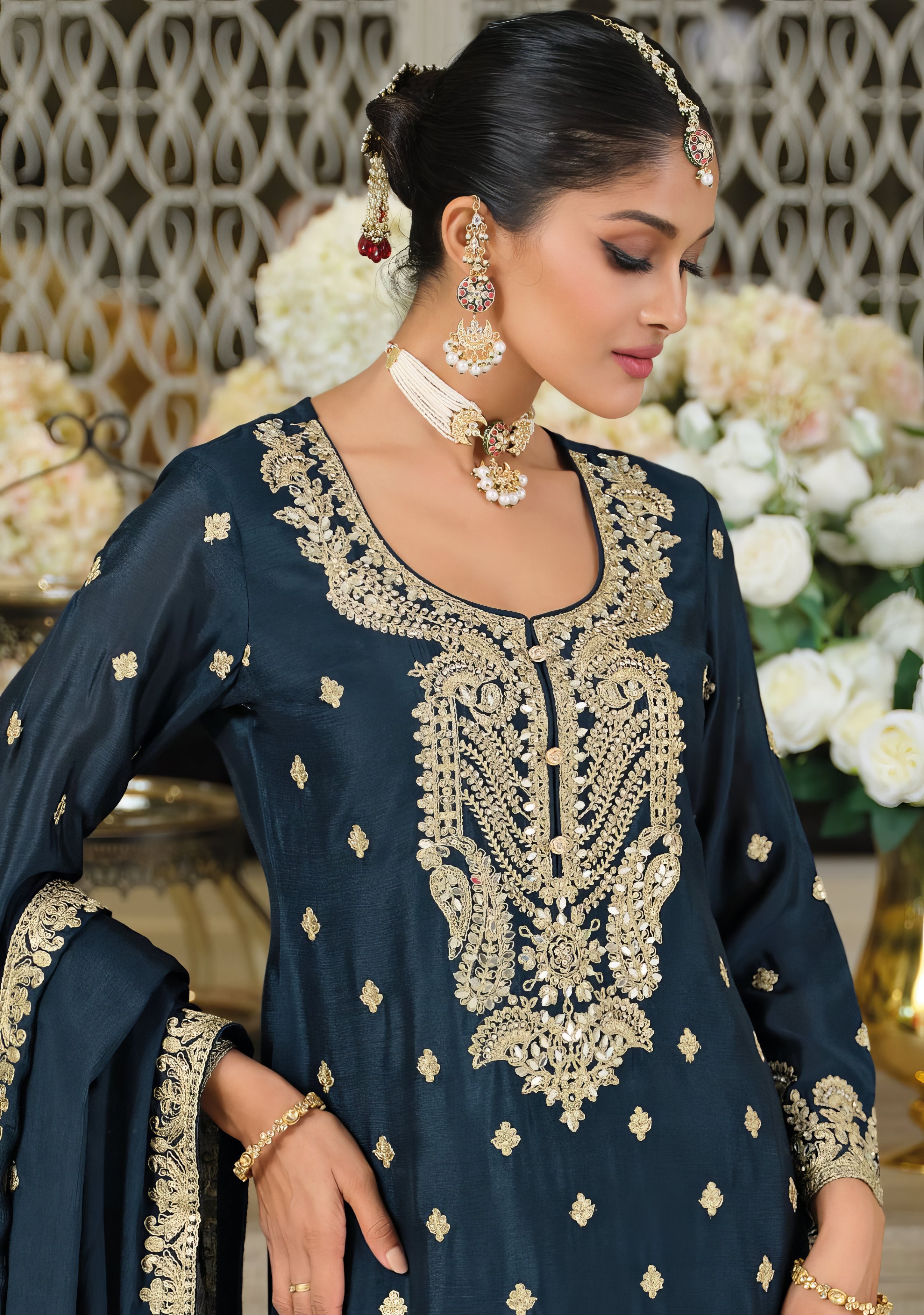 This elegant set is beautifully crafted in heavy Chinon fabric with exquisite embroidery work. The top showcases intricate embroidery for a rich, festive look, paired with a matching embroidered Chinon plazo for comfort and style. Completing the ensemble is a Chinon dupatta featuring delicate embroidery, making it a perfect outfit for special occasions.