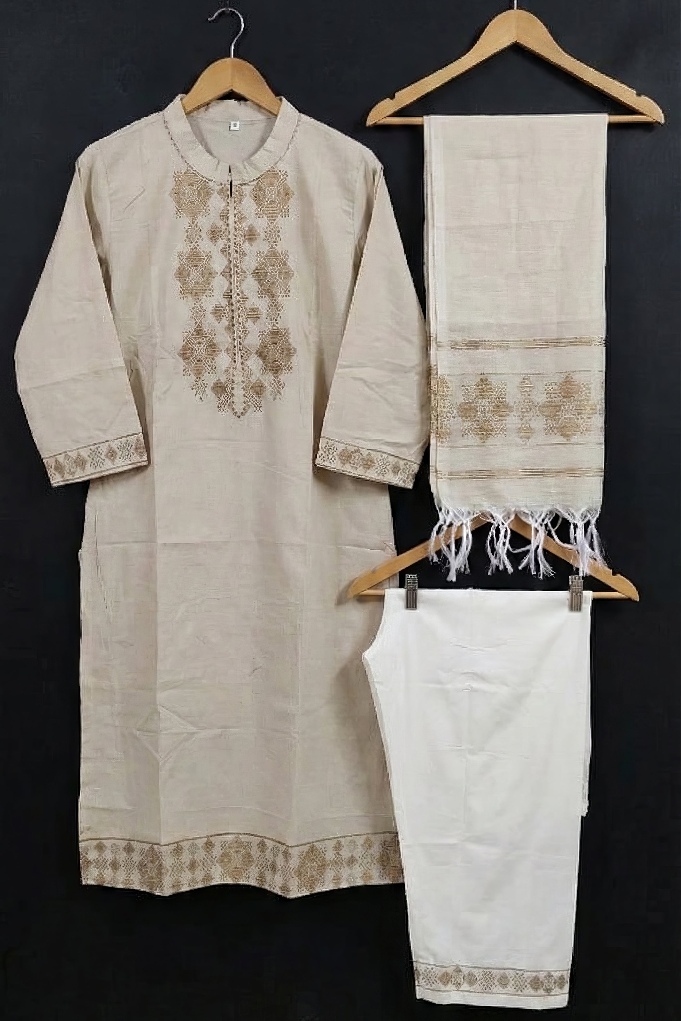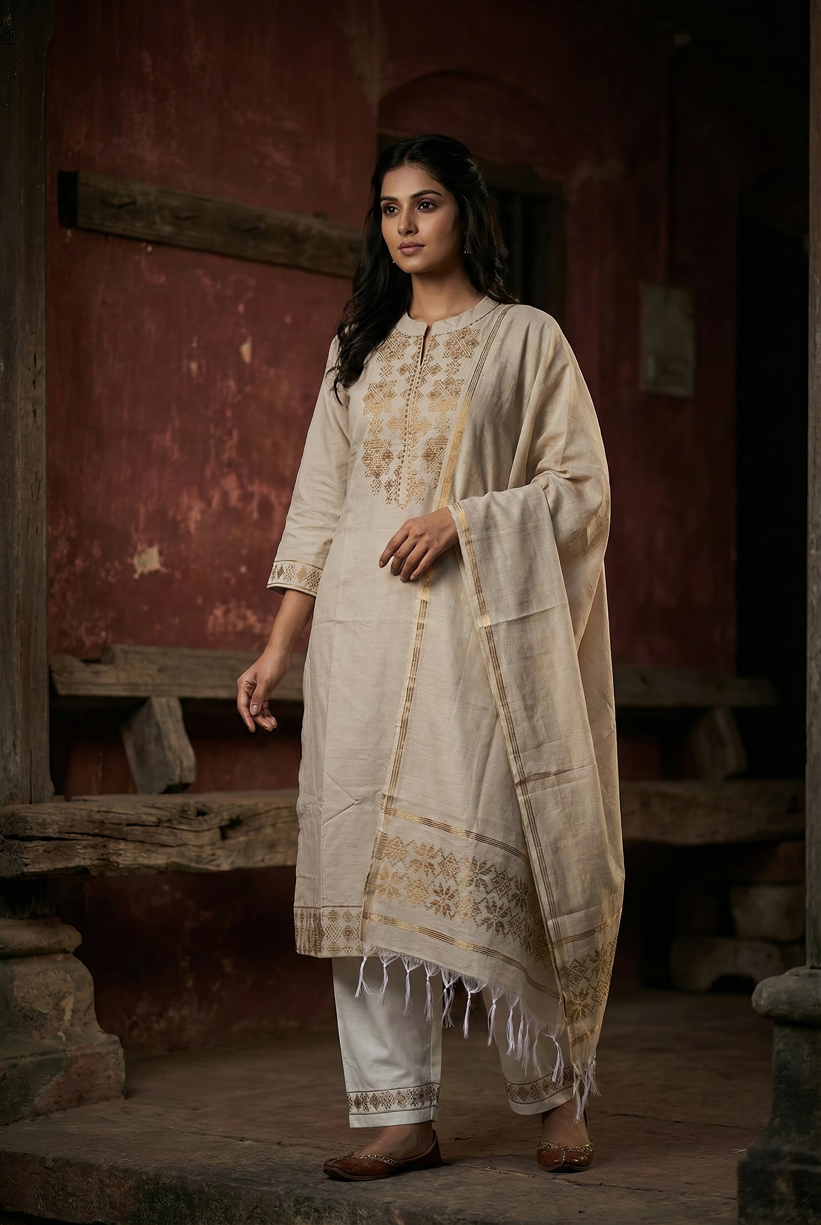 This elegant kurta set features a beautifully crafted cotton jacquard top paired with a comfortable cotton bottom. The set is completed with a flex cotton jacquard dupatta that enhances the overall ethnic appeal. Designed with subtle jacquard detailing, this outfit offers a perfect balance of comfort and style in a classic cream shade.