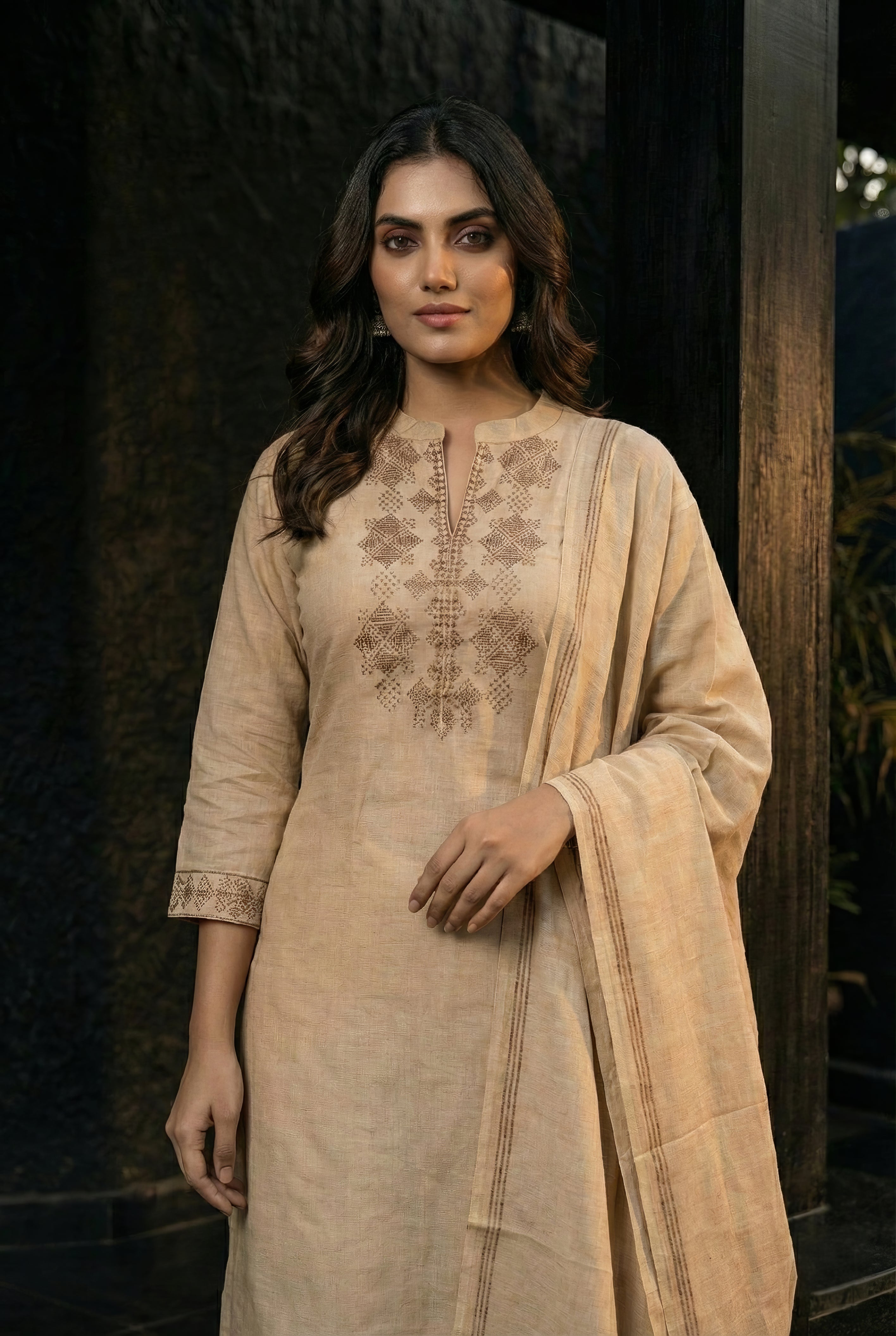 This elegant kurta set is crafted from premium cotton jacquard fabric, featuring a subtle woven design that adds texture and richness to the outfit. The cotton kurta offers comfort with a refined look, paired with a breathable cotton bottom for all-day ease. The flex cotton jacquard design dupatta complements the set beautifully, completing the ensemble with a graceful finish. Presented in a soothing cream colour, this set is ideal for both casual elegance and festive styling.