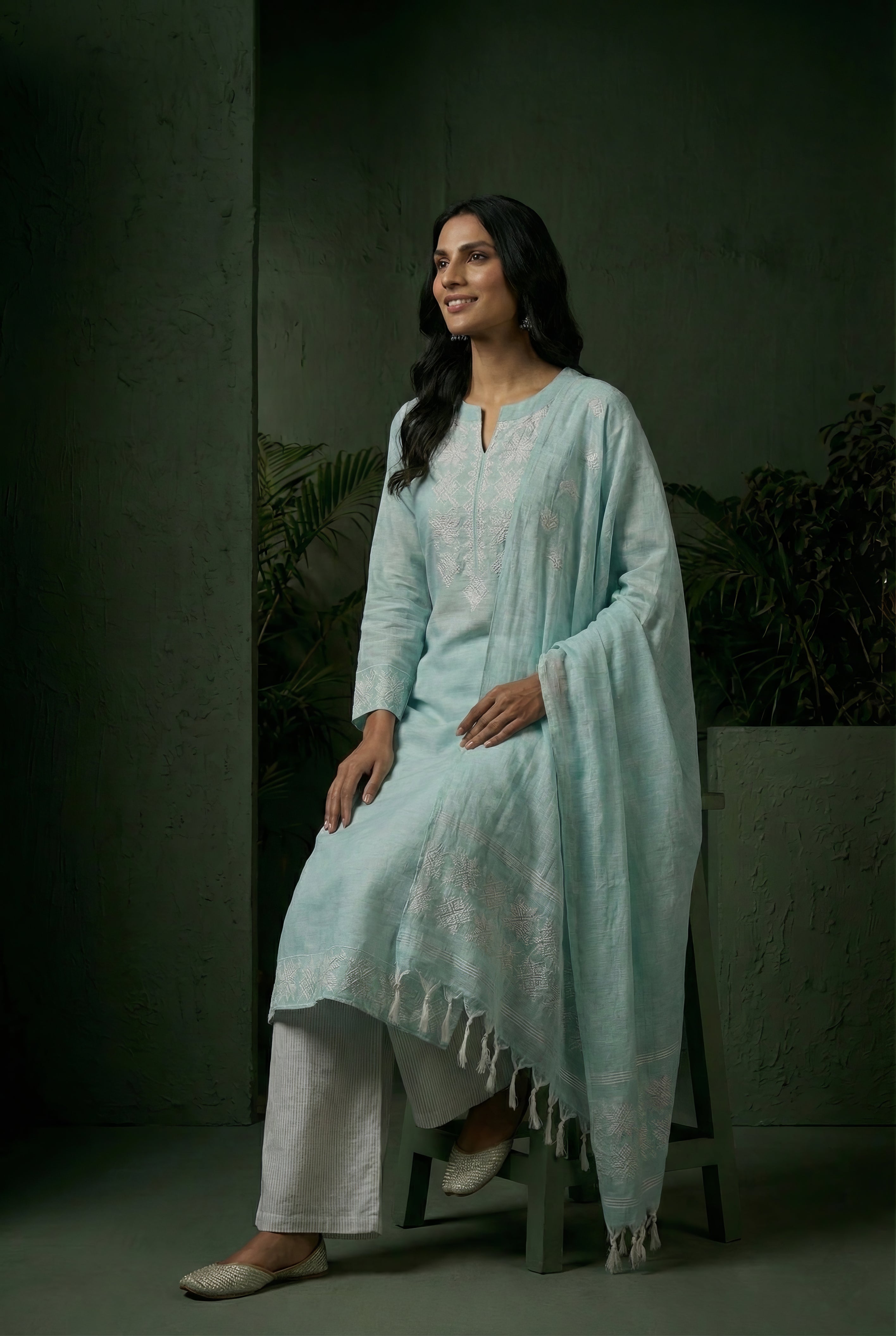 Pista Cotton Jacquard Design Kurta Set with Flex Cotton Dupatta