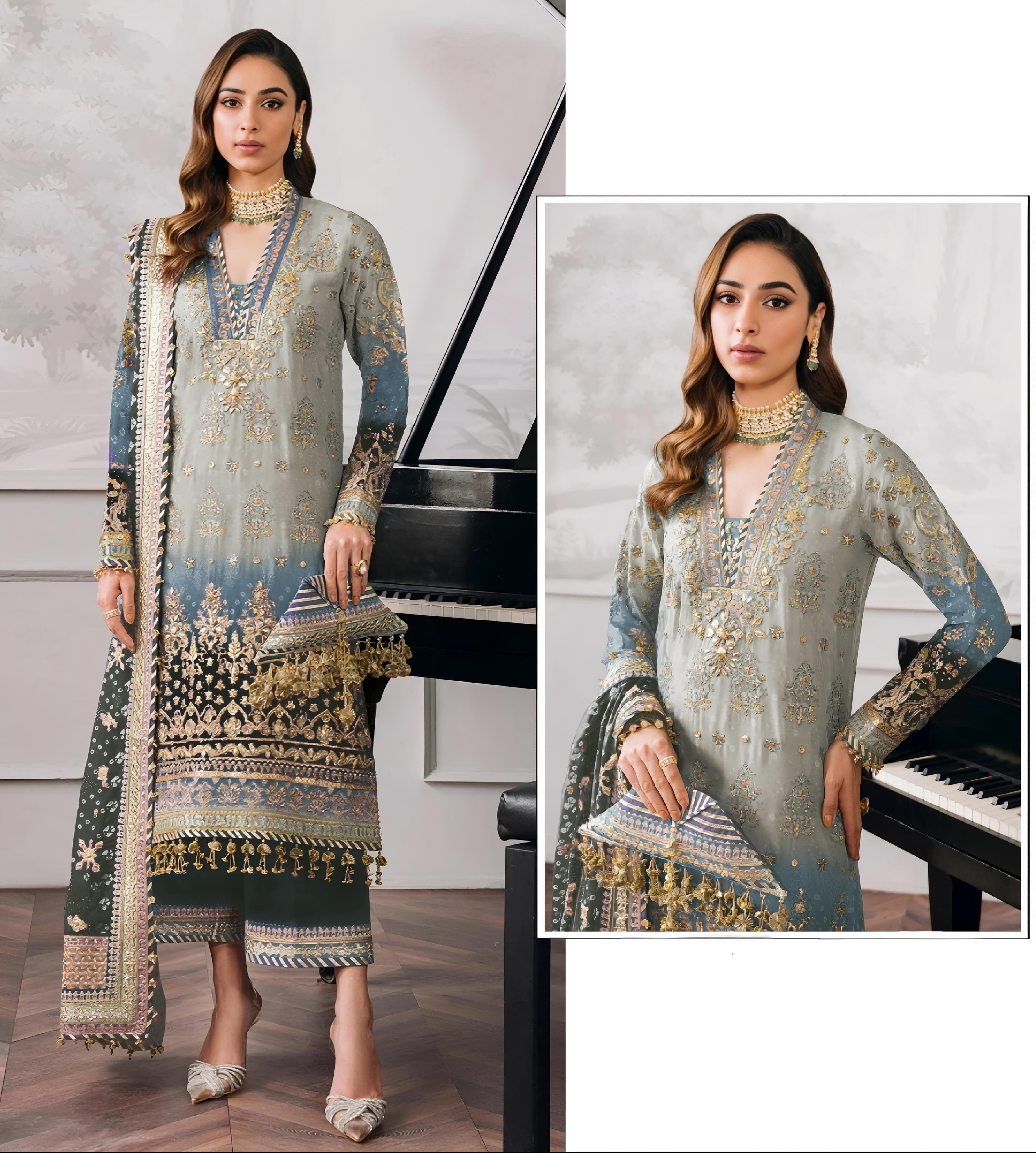Designed for graceful sophistication, this Heavy Fox Georgette suit set beautifully blends digital artistry with intricate embroidery — ideal for festive evenings or elegant gatherings.