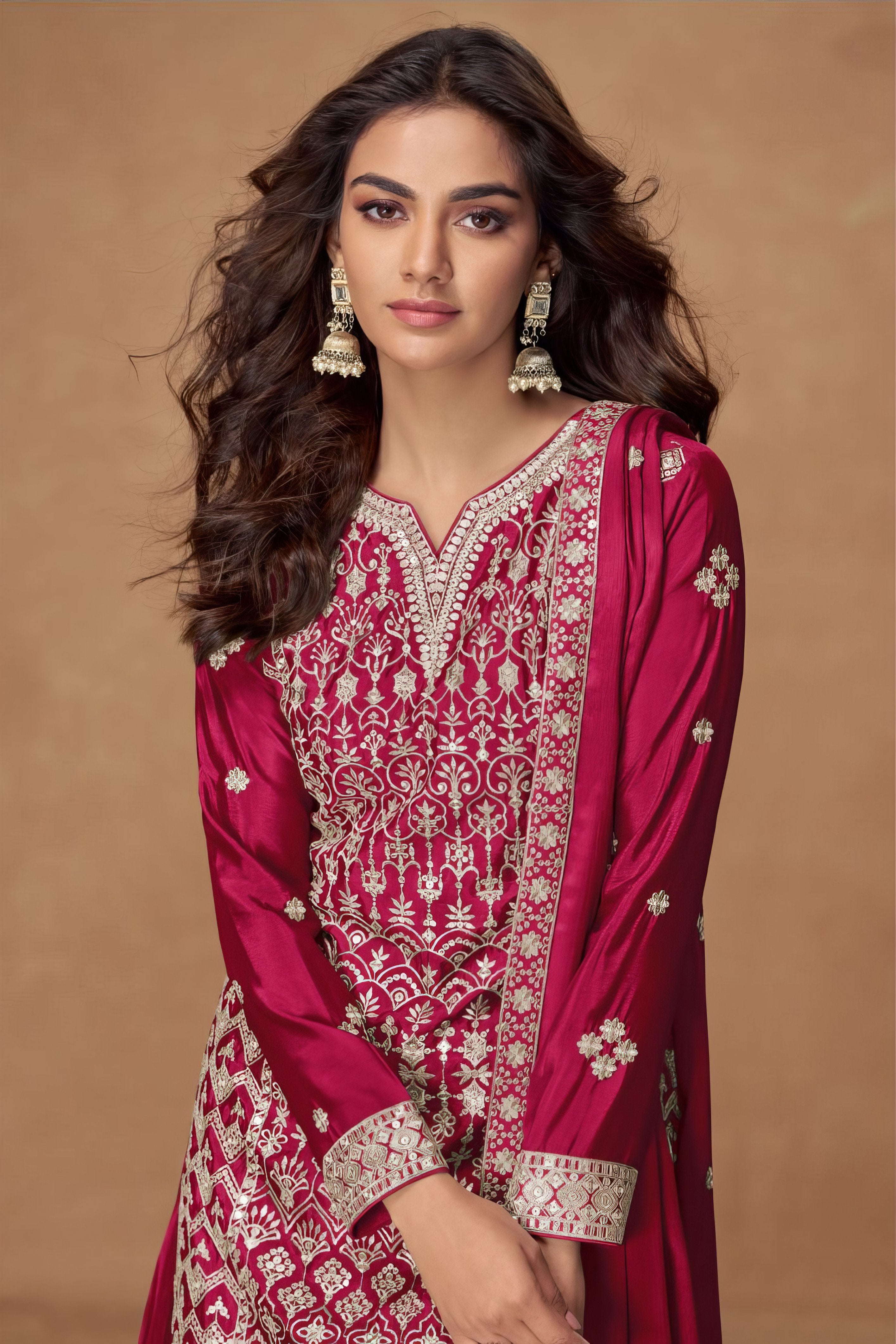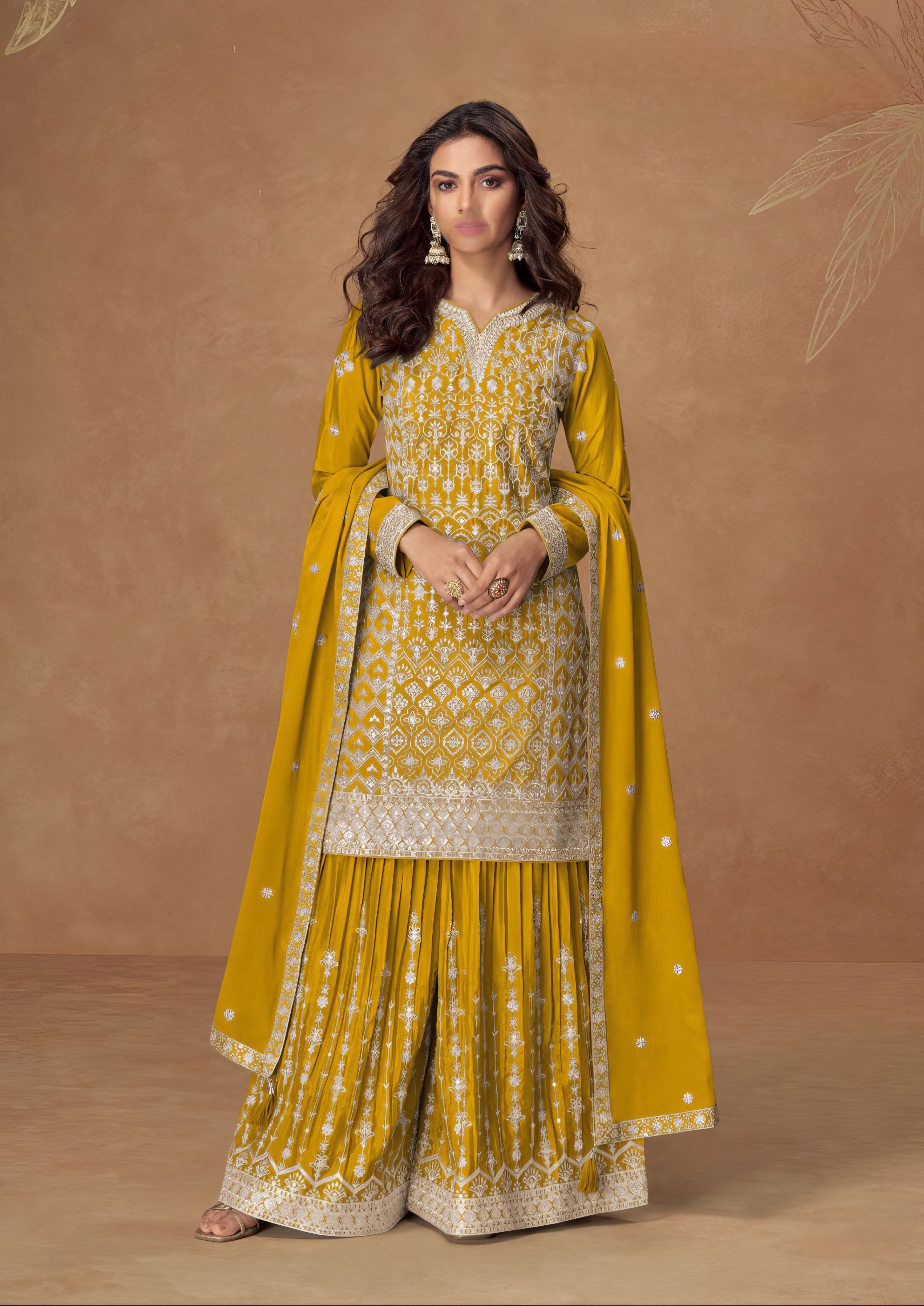 This designer sharara set is tailored from luxurious premium chinnon silk, offering a smooth texture and rich sheen. The top, crafted in fine chinnon silk, exudes timeless elegance, while the flowing sharara bottom adds volume and a statement appeal. Completing the ensemble is a matching chinnon silk dupatta that enhances the outfit’s refined charm. Designed with finesse, this sharara set is the perfect blend of sophistication and tradition, making it an ideal choice for grand occasions.
