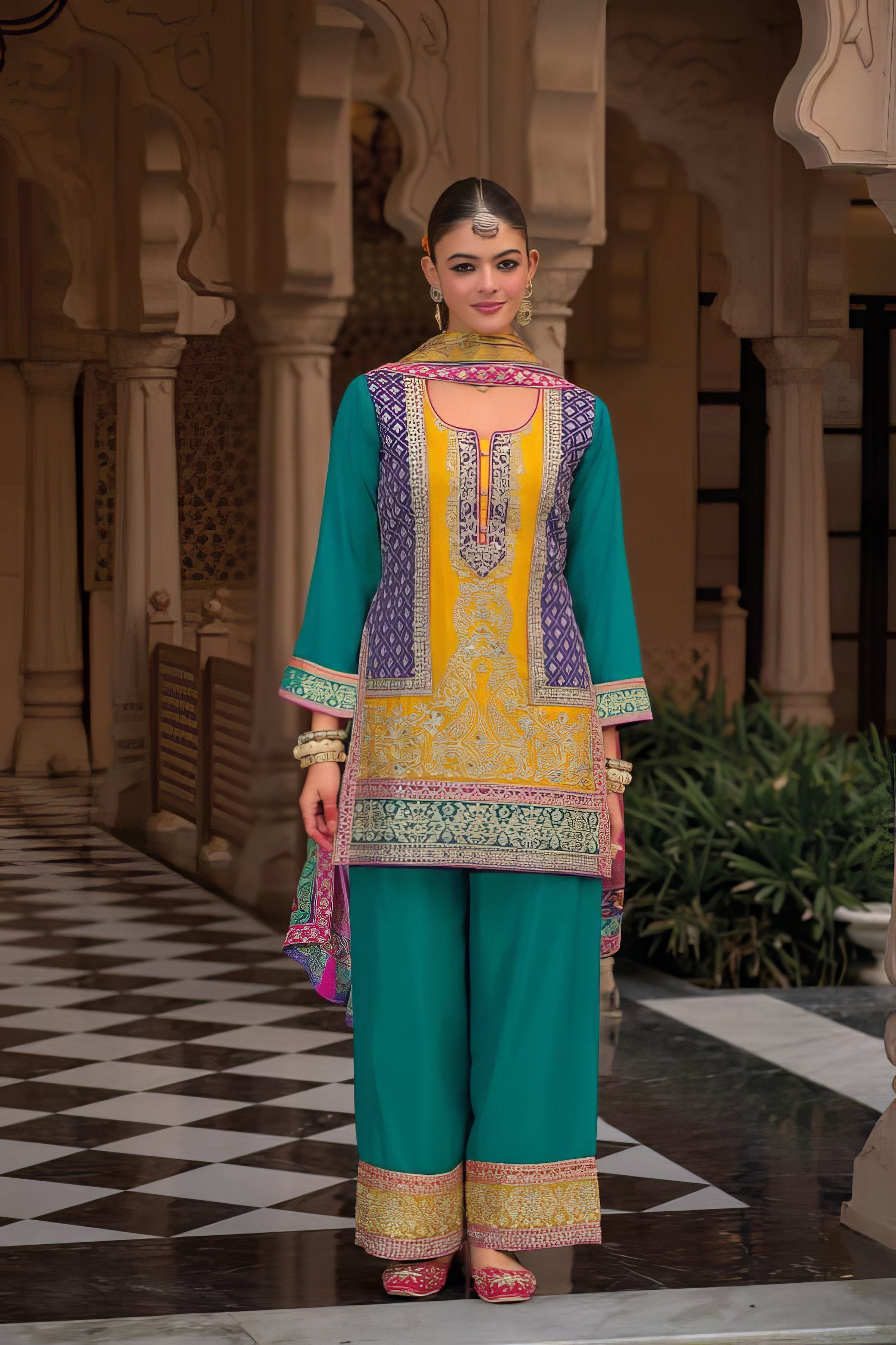 This premium set is crafted in luxurious heavy chinon fabric, showcasing detailed embroidery for a rich and elegant appeal. The top is highlighted with intricate embroidery work, while the matching plazo features heavy embroidery on both the front and back, adding sophistication with comfort. The chinon dupatta, digitally printed and enhanced with embroidery, completes the outfit with a perfect fusion of tradition and contemporary style.
