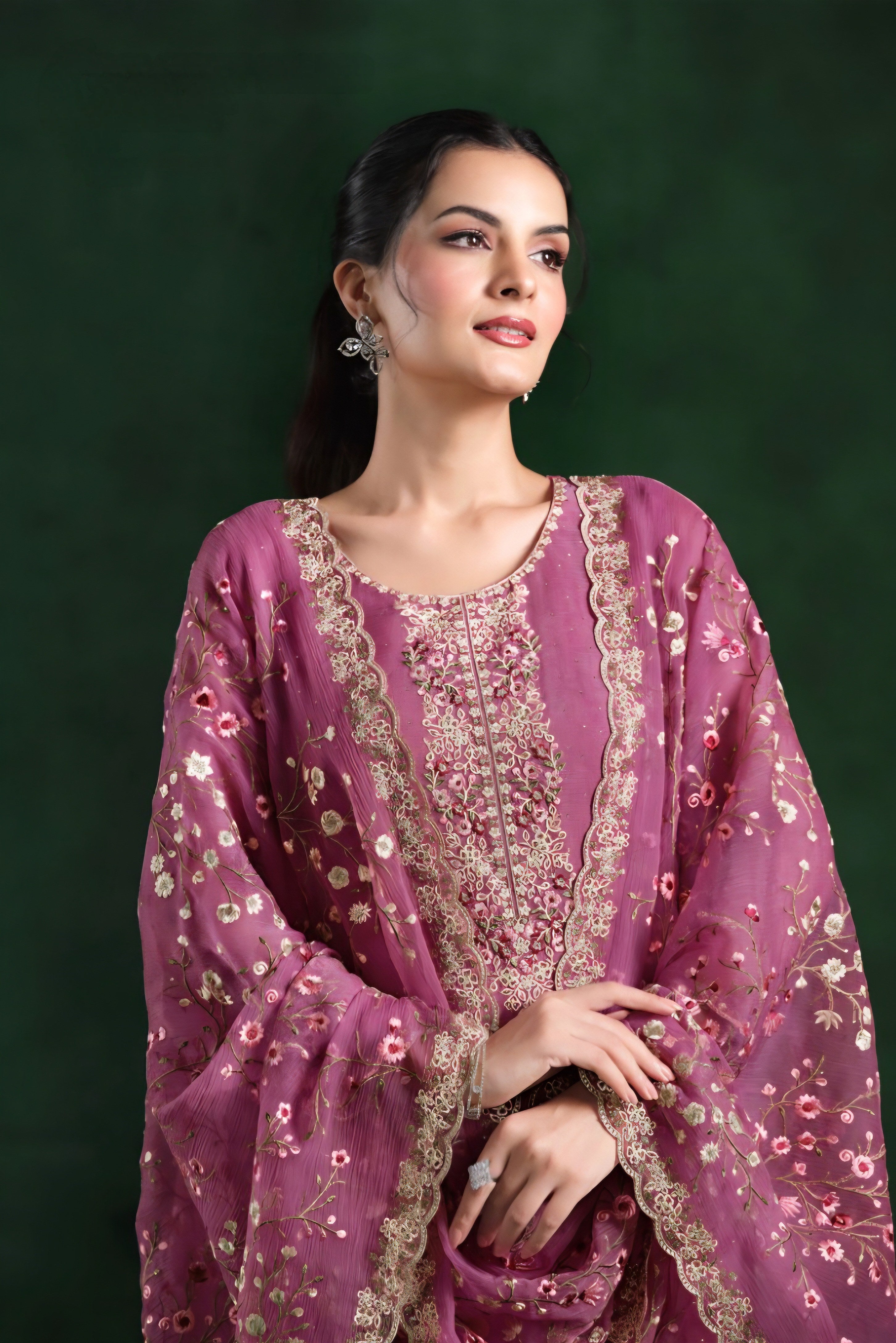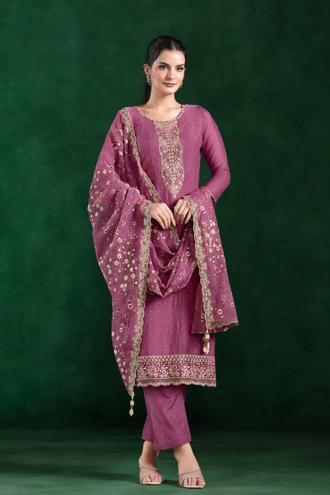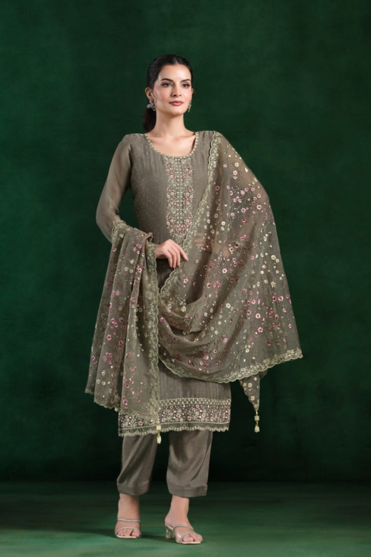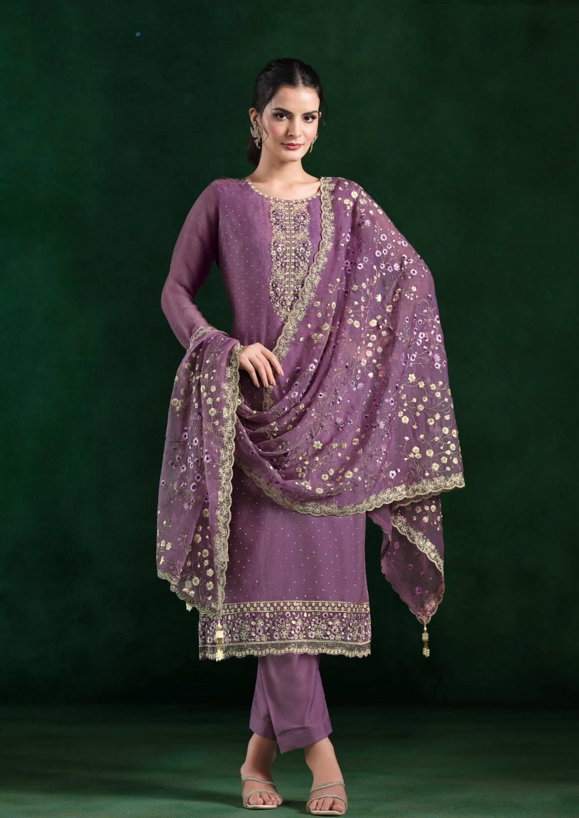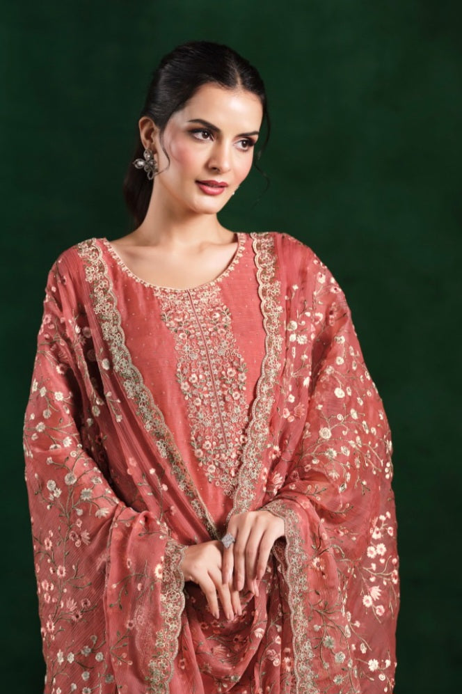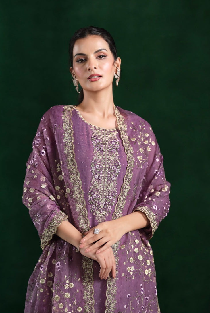 Grace meets glamour in this dazzling Crinkle Chiffon suit, adorned with delicate embroidery and Swarokshi sparkle — perfect for festive elegance.