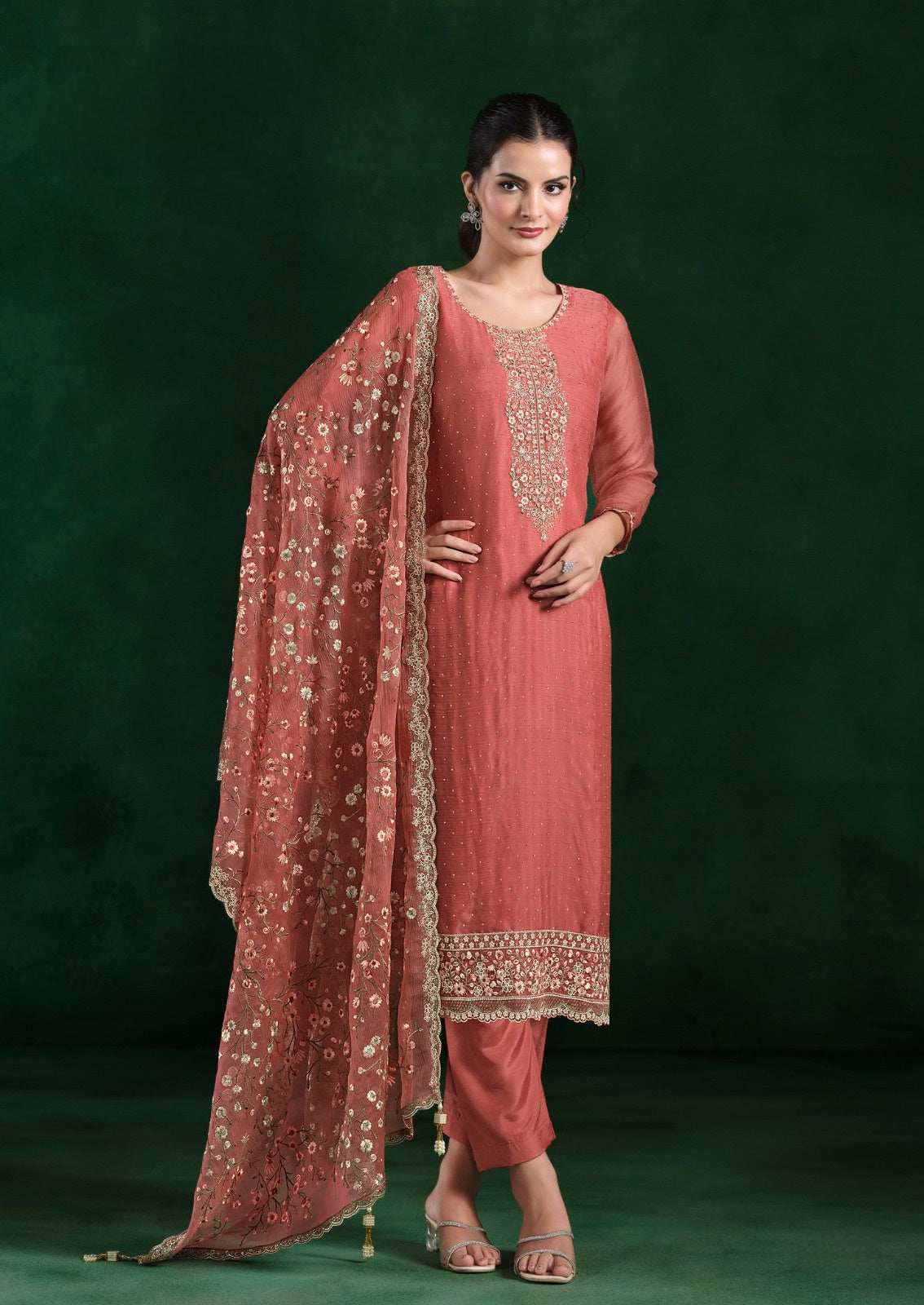 Dupatta: The matching Crinkle Chiffon dupatta mirrors the top with embroidery and Swarokshi work, completing the look with fluid elegance.