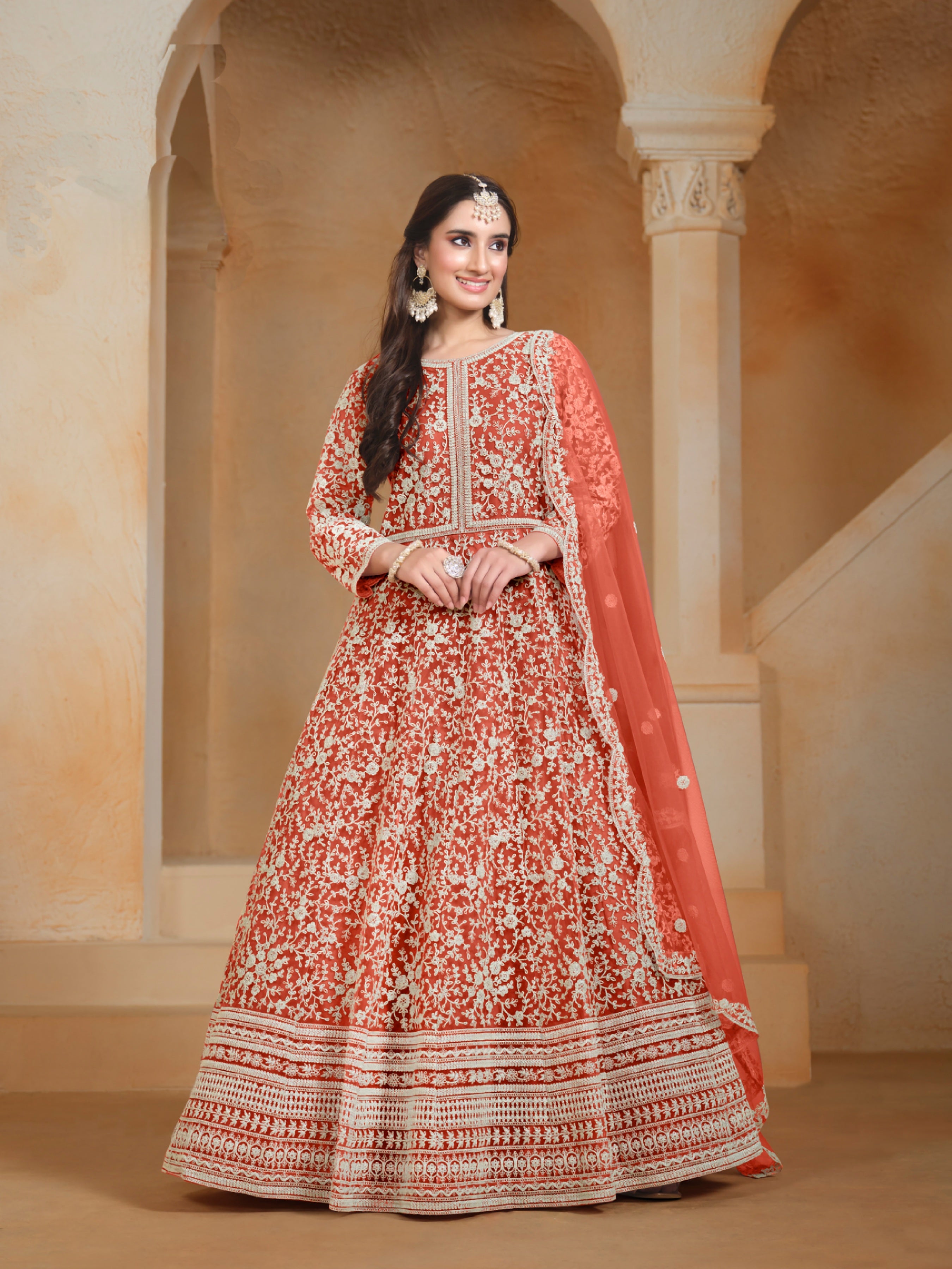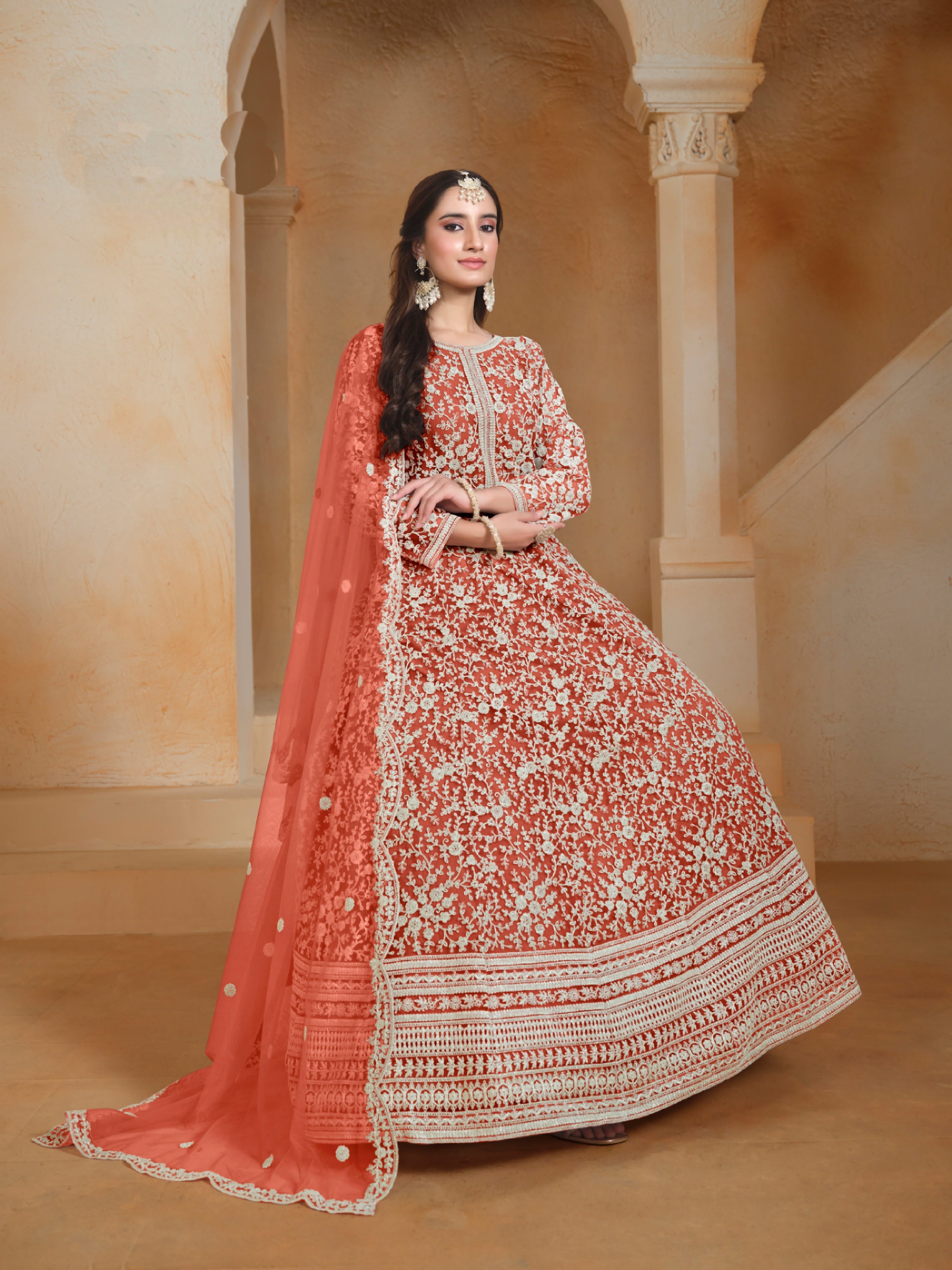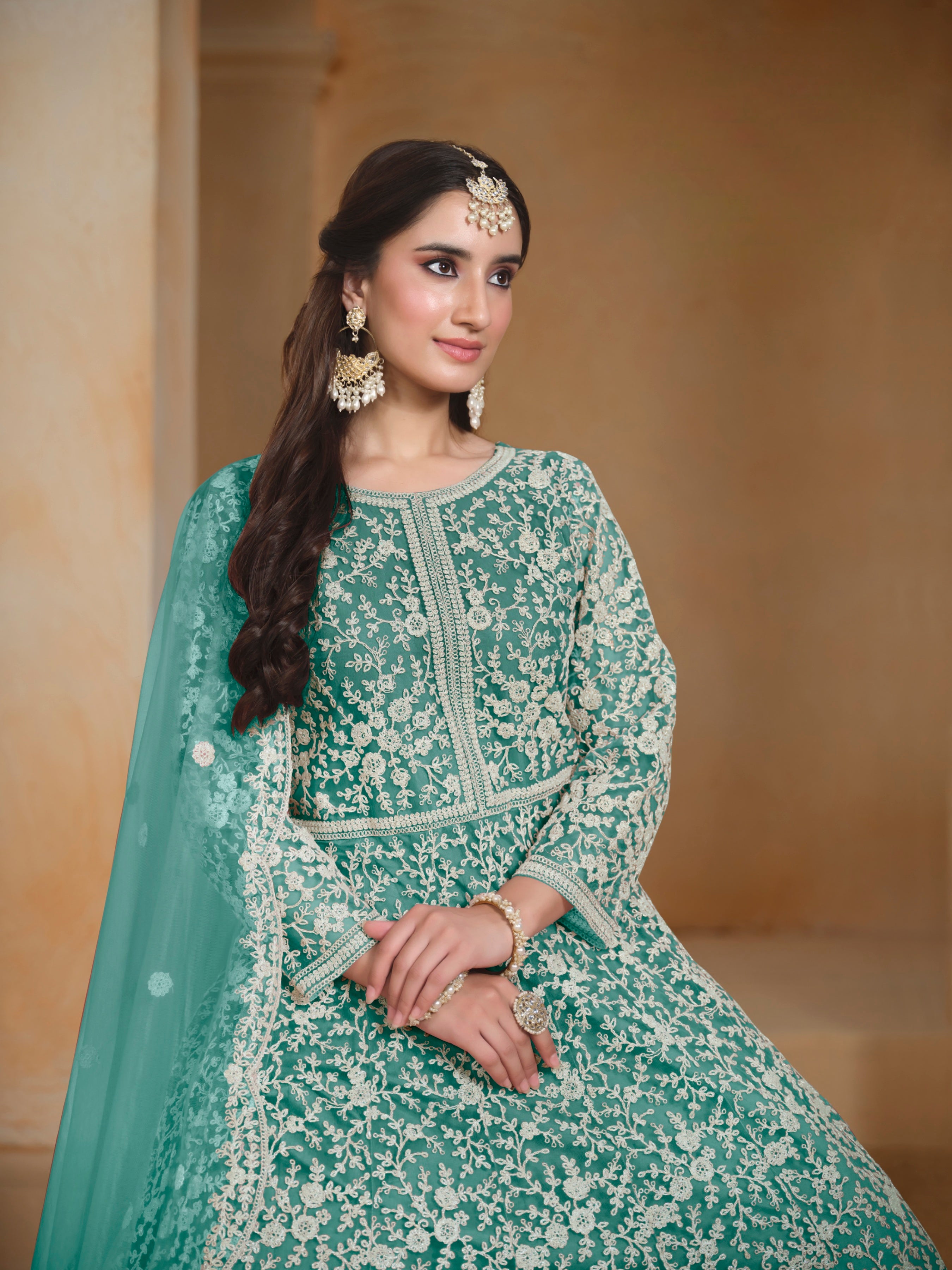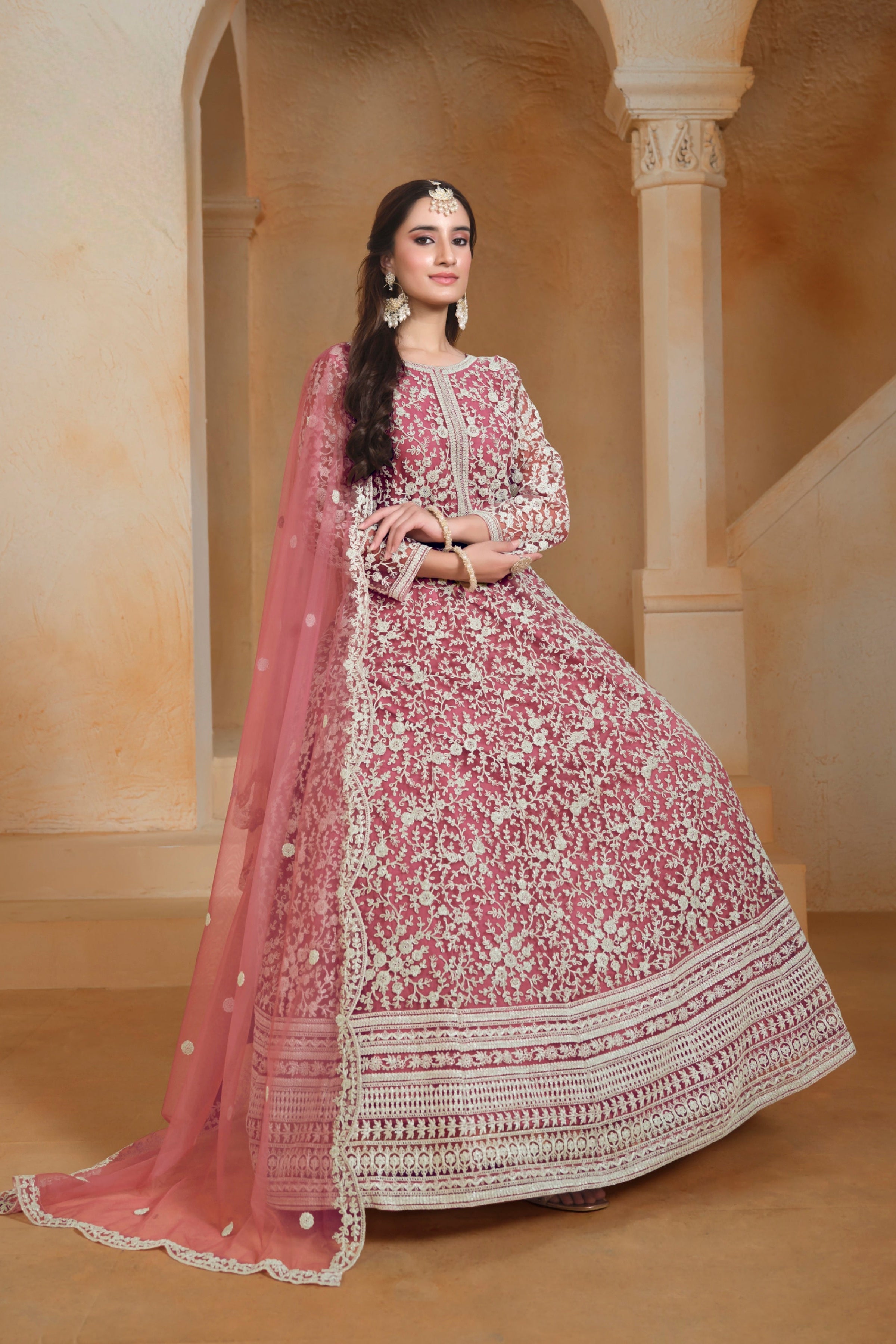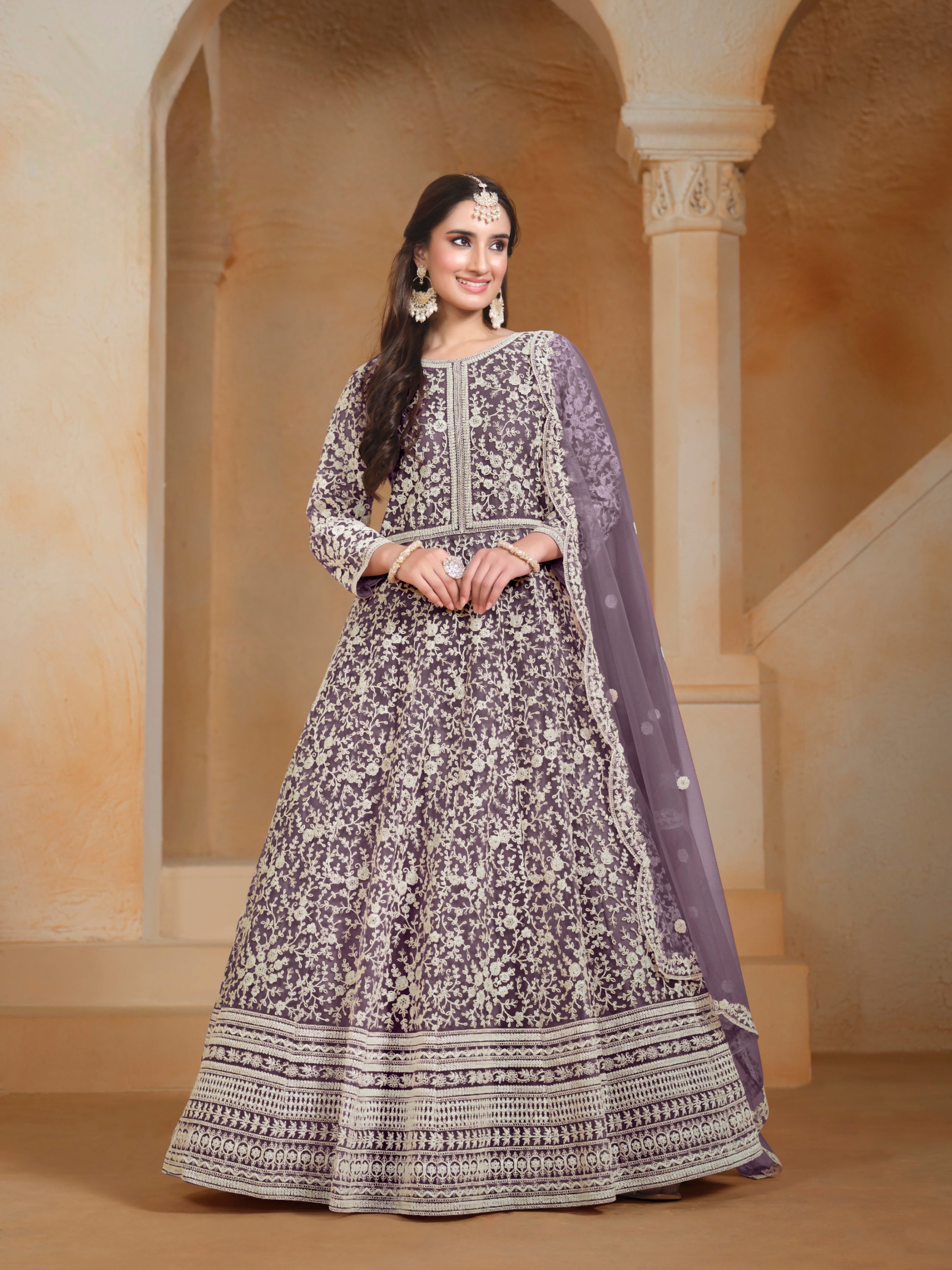A light, dreamy ensemble crafted in delicate net fabric—perfect for graceful celebrations and evening elegance.