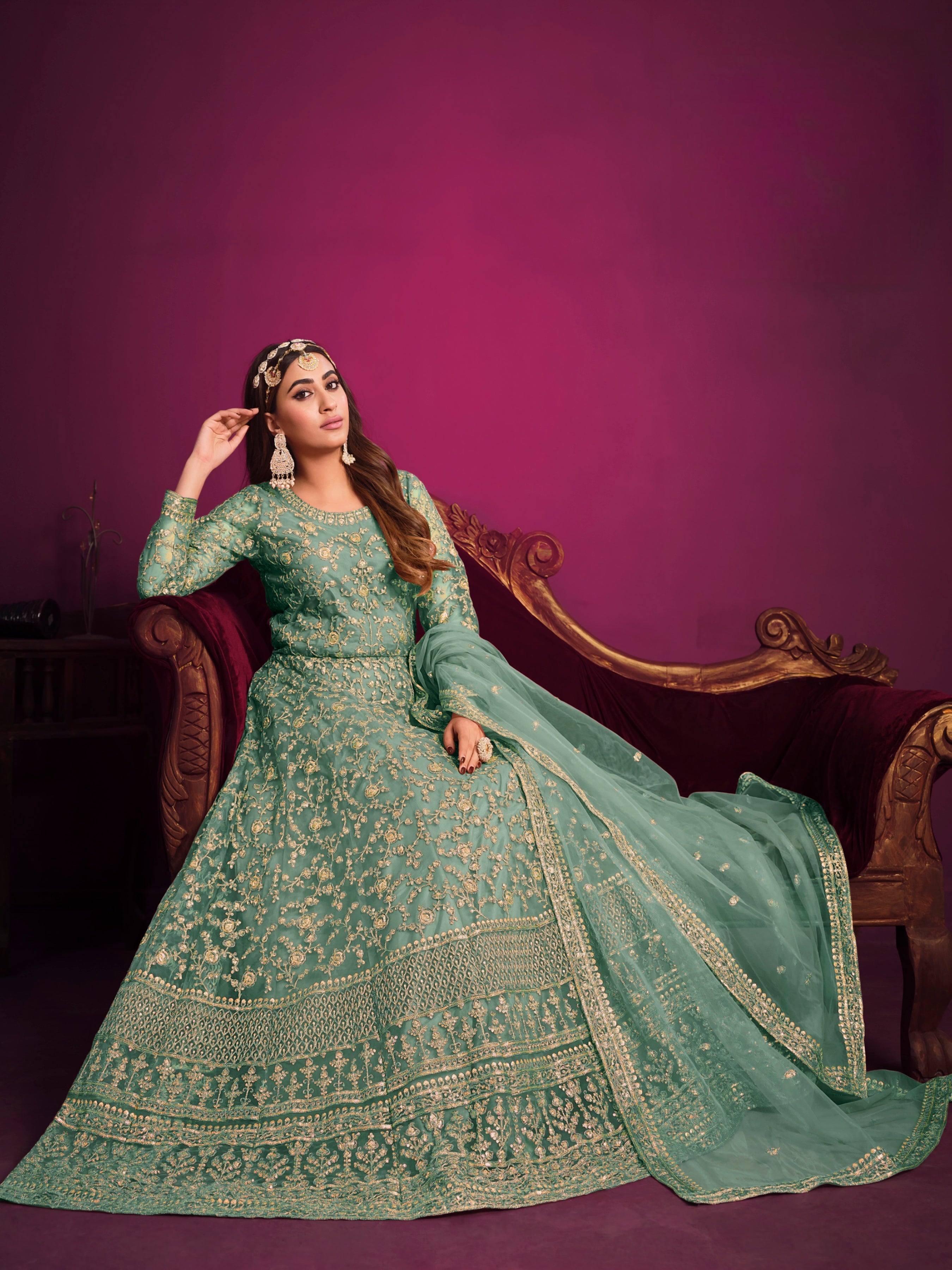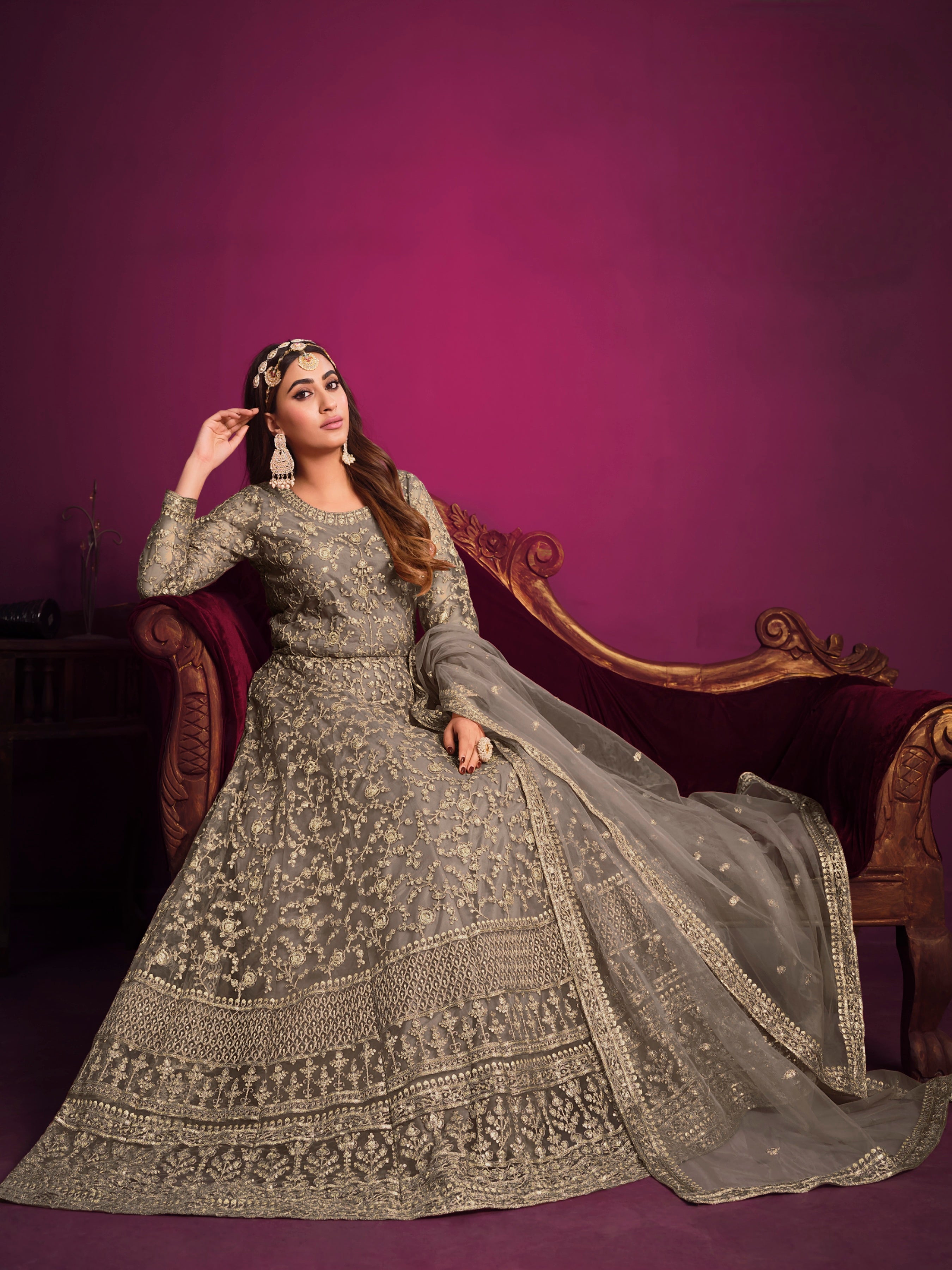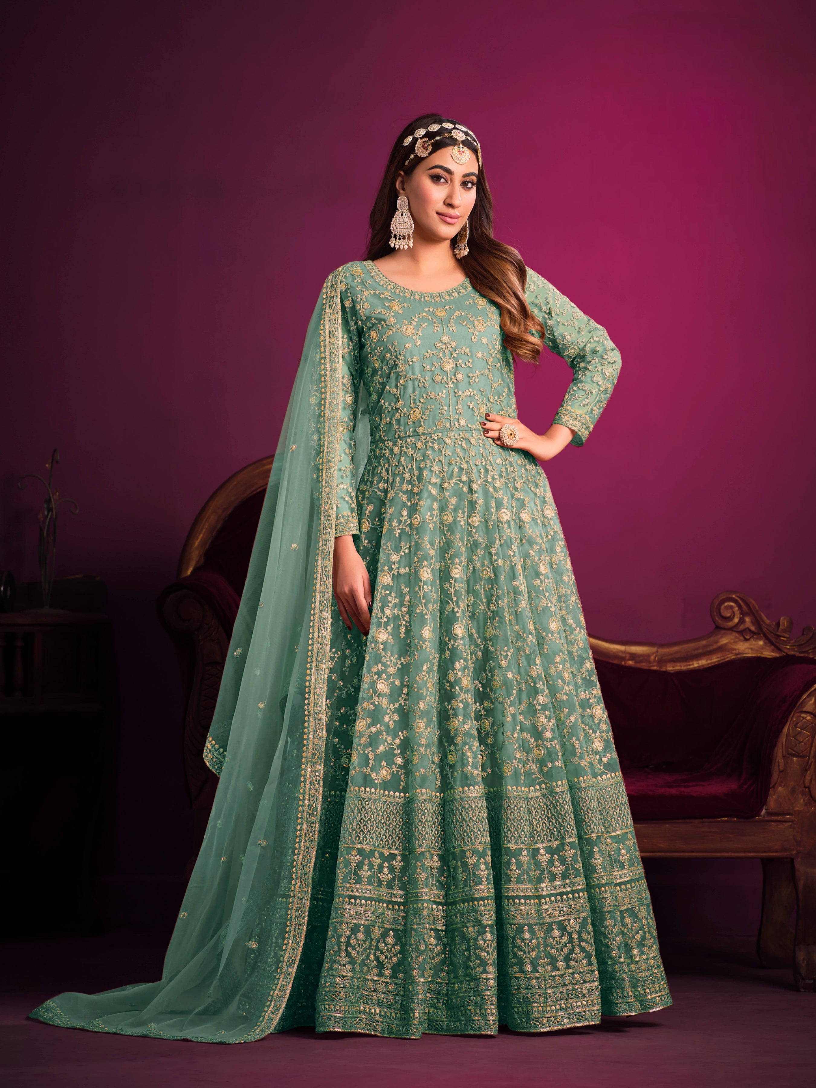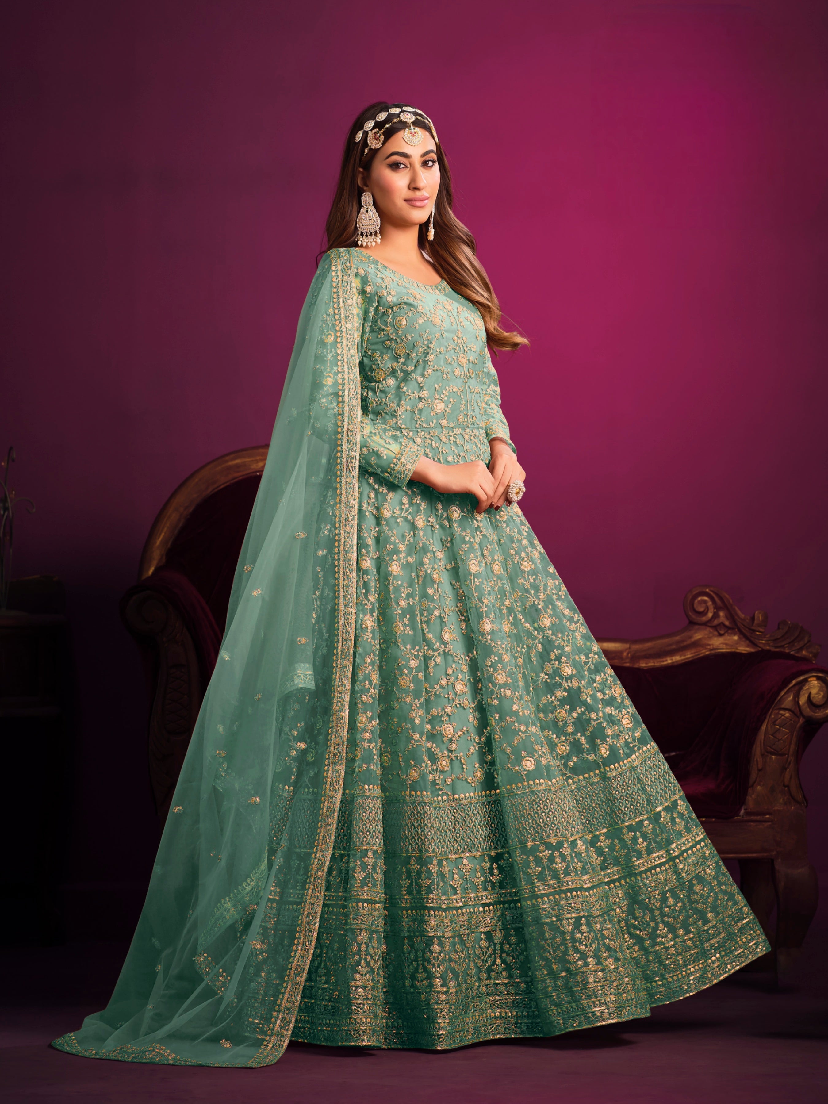 A delicate and festive ensemble crafted with embroidered net, designed to make you glow with grace and elegance.