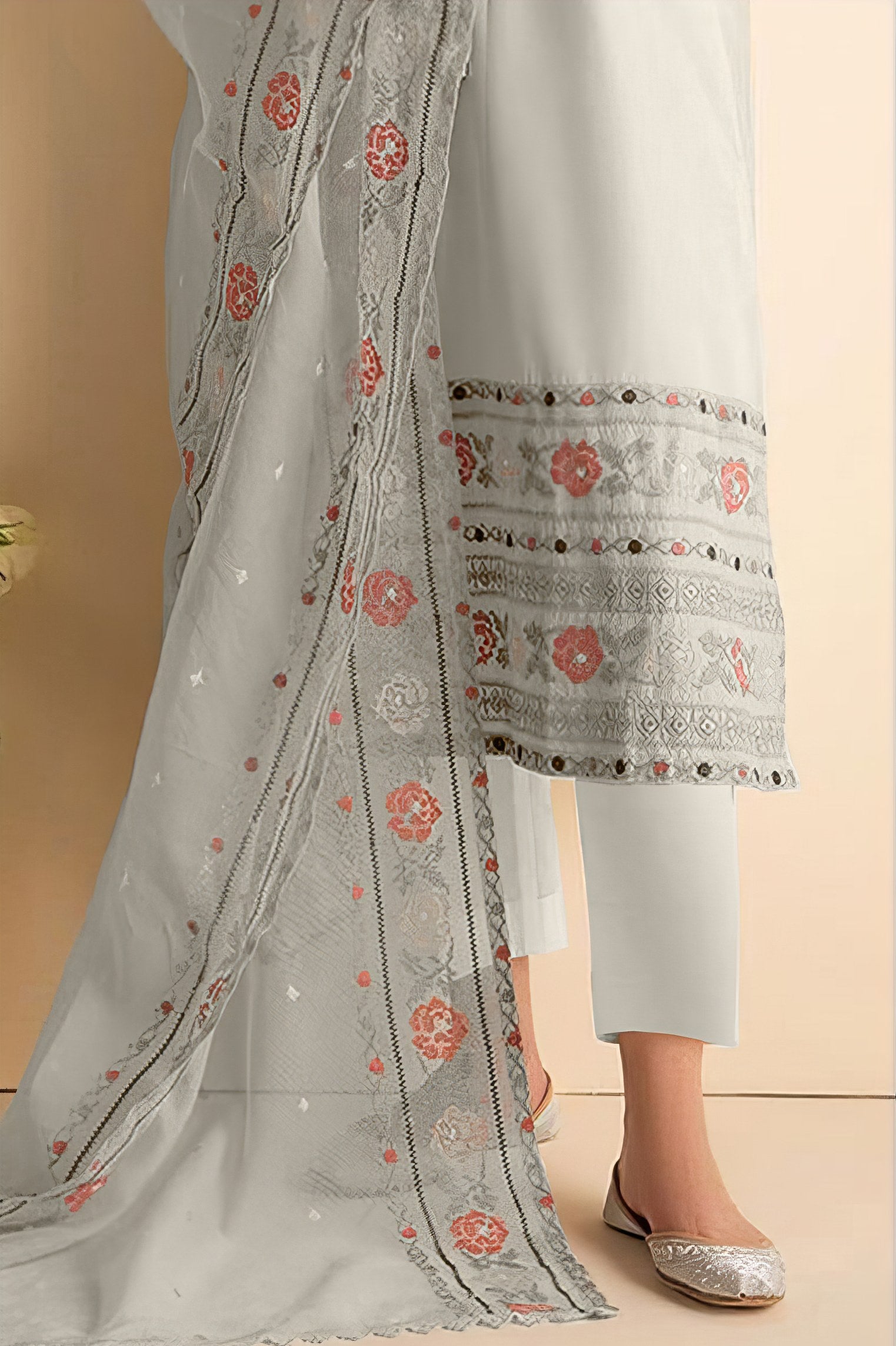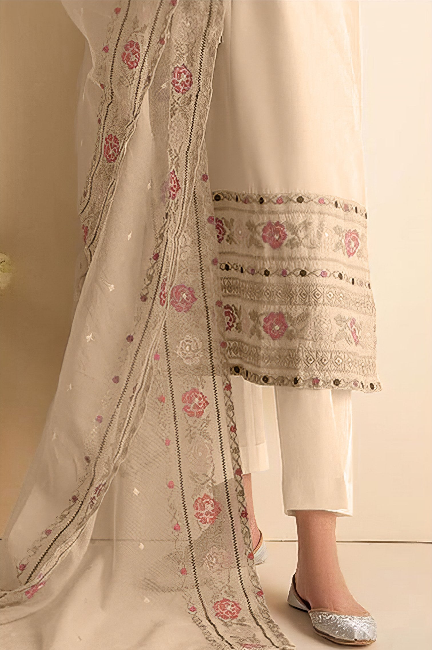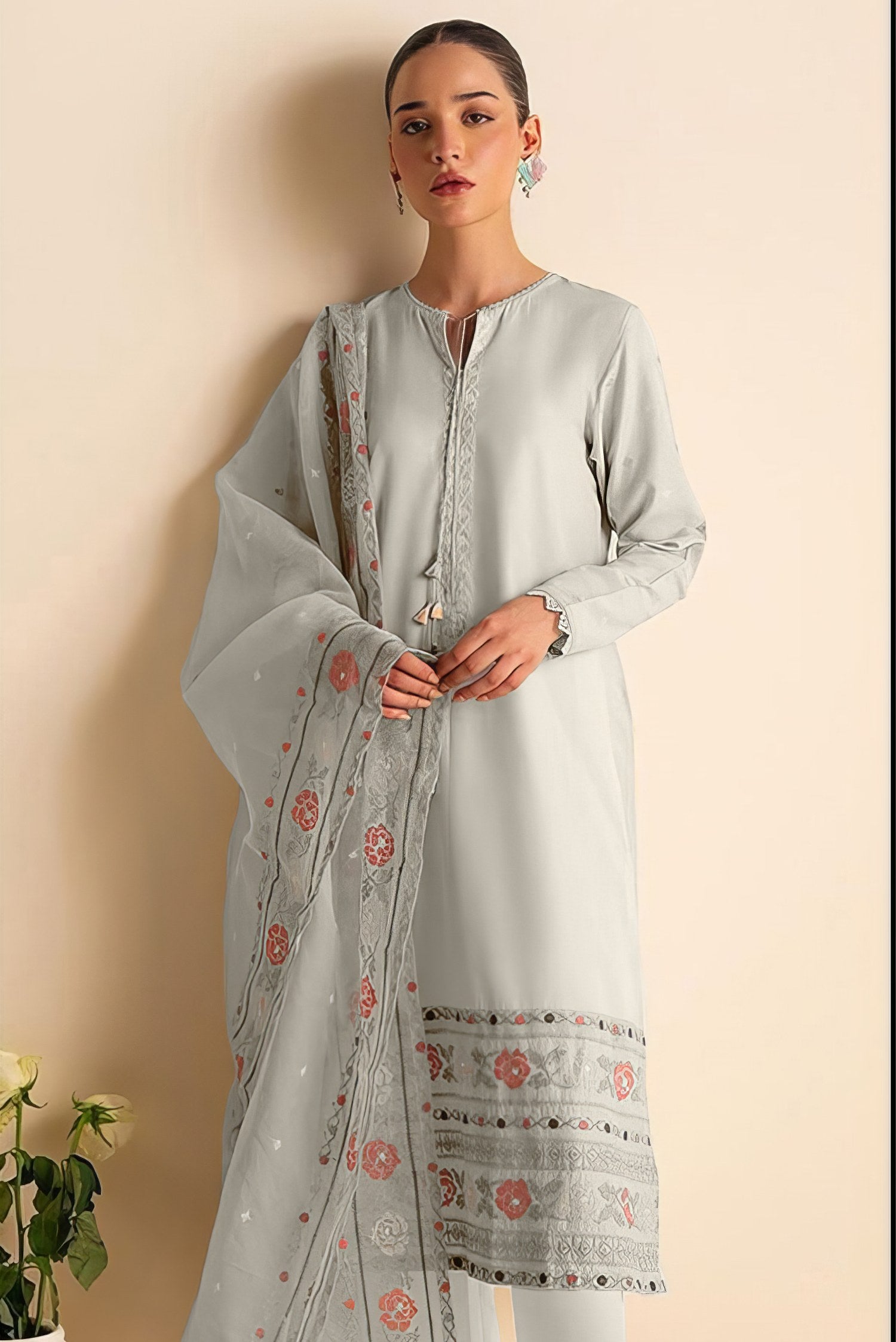 Luxurious in texture and fluid in drape, this fully stitched Viscose Silk suit set is the epitome of understated glamour. Paired with a beautifully flowing bottom and a sheer heavy organza dupatta, it’s ideal for festive gatherings, celebrations, or evening elegance.